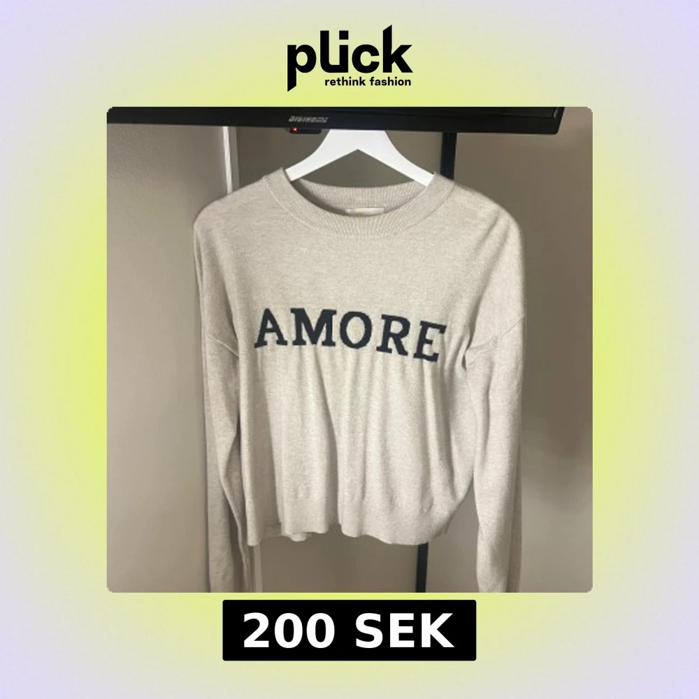 Säljer en beige stickad tröja med svart text 'AMORE' framtill från Gina Tricot Young. Super skön och passar XS/S. Säljer då den ej kommer till användning❣️