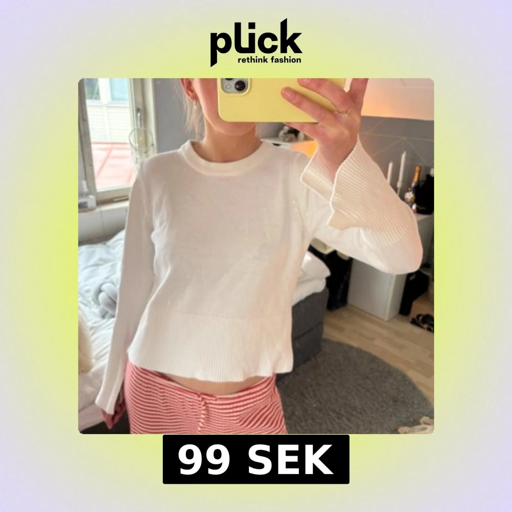 Vit stickad tröja. Använd fåtal gånger i storlek M men sitter som en S skulle jag säga!