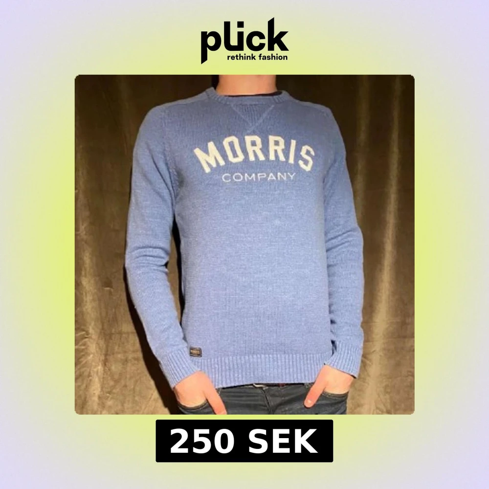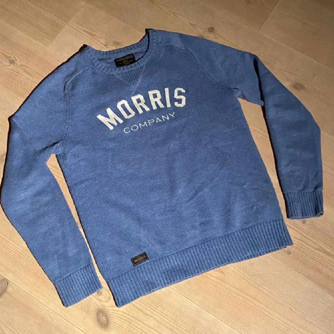 Säljer en snygg blå tröja från Morris med vit text på bröstet. Tröjan har långa ärmar och ribbade muddar vid ärmslut och nederkant. Perfekt för en stilren look.