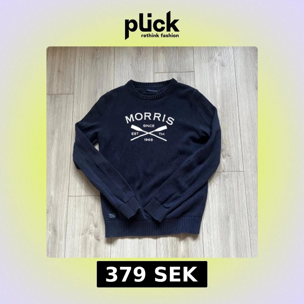 Snygg mörkblå stickad tröja från Morris med vit logga och text framtill. Tröjan har rund halsringning, långa ärmar och ribbade muddar vid ärmslut och nederkant. Perfekt för dig som gillar klassisk och stilren design.