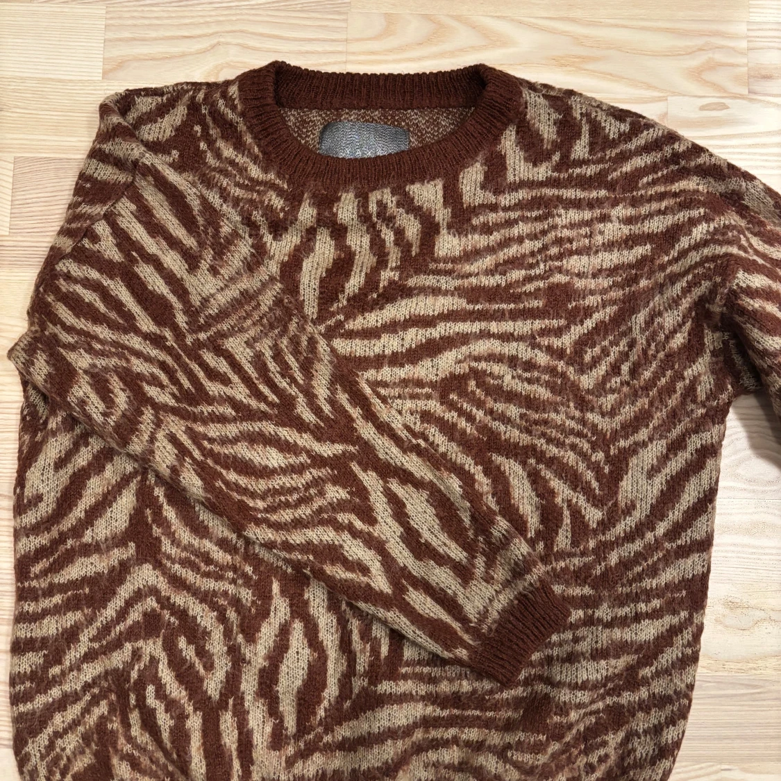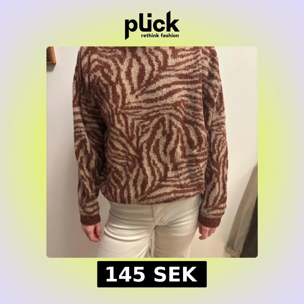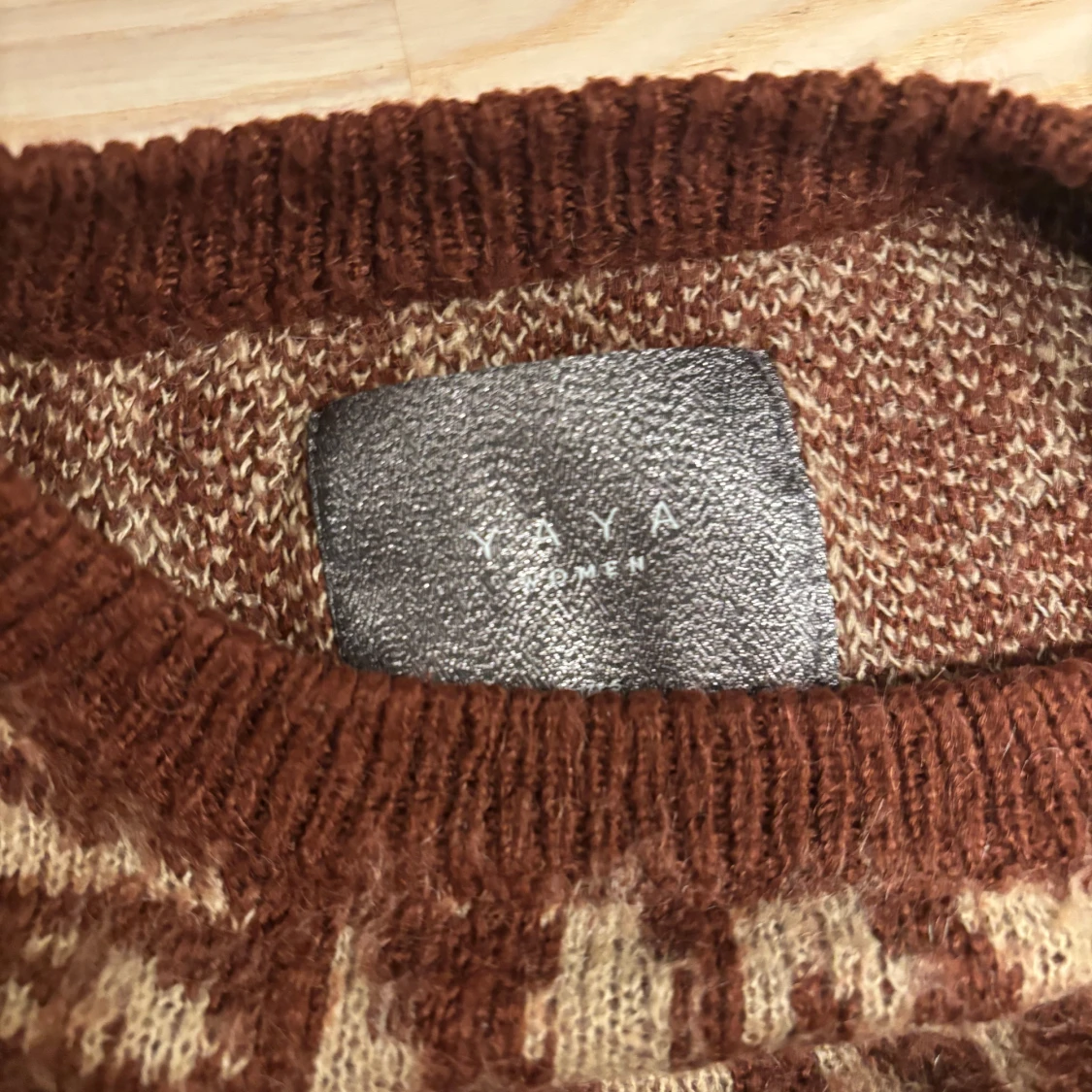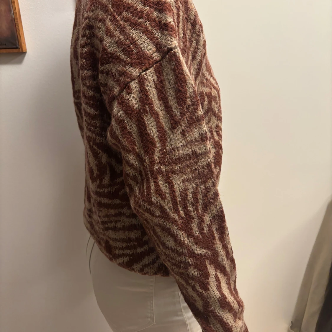 Säljer en snygg brunmönstrad stickad tröja från YAYA. Tröjan har ett zebramönster i burgundy och beige och är långärmad med ribbade muddar. Perfekt för att hålla sig varm och stilren.
