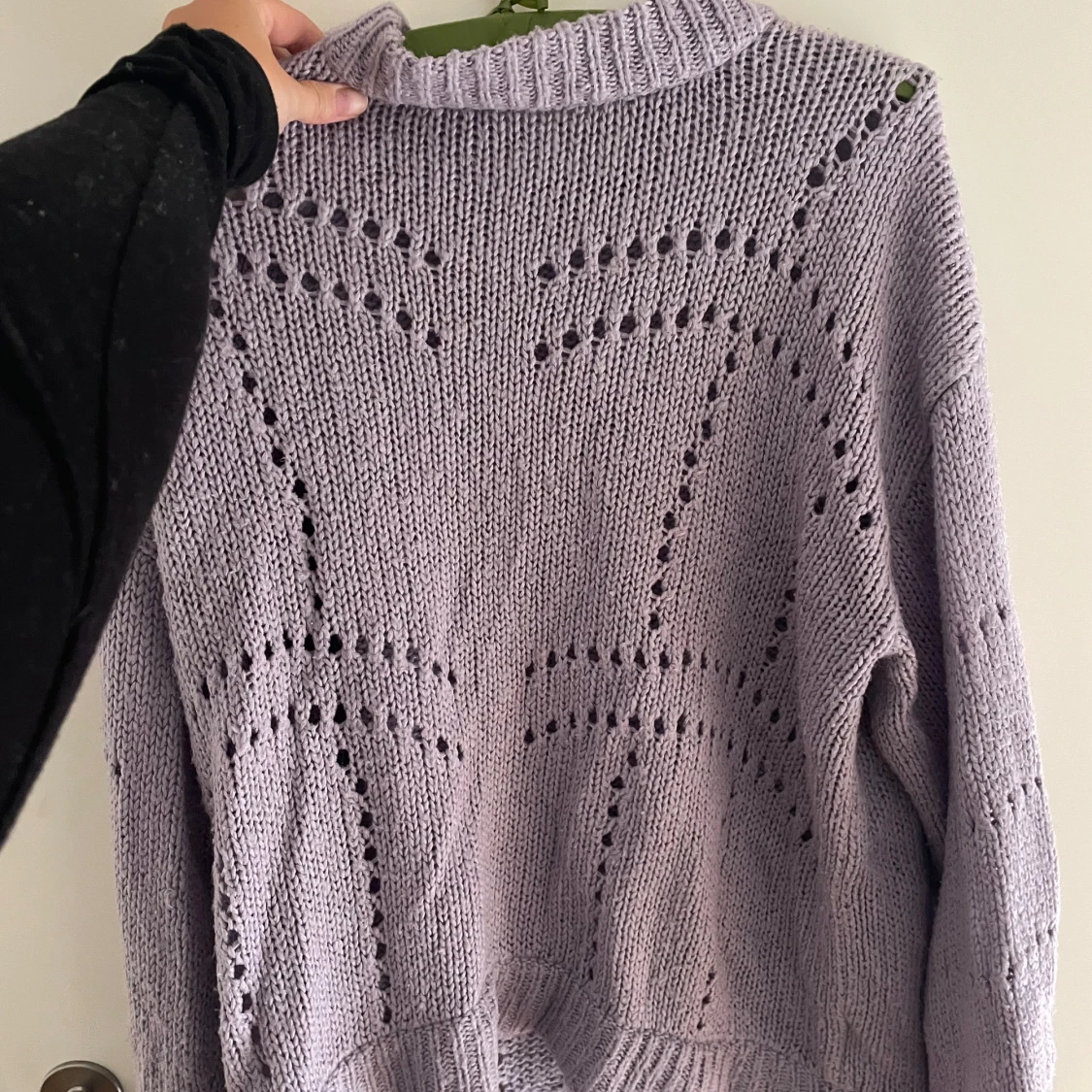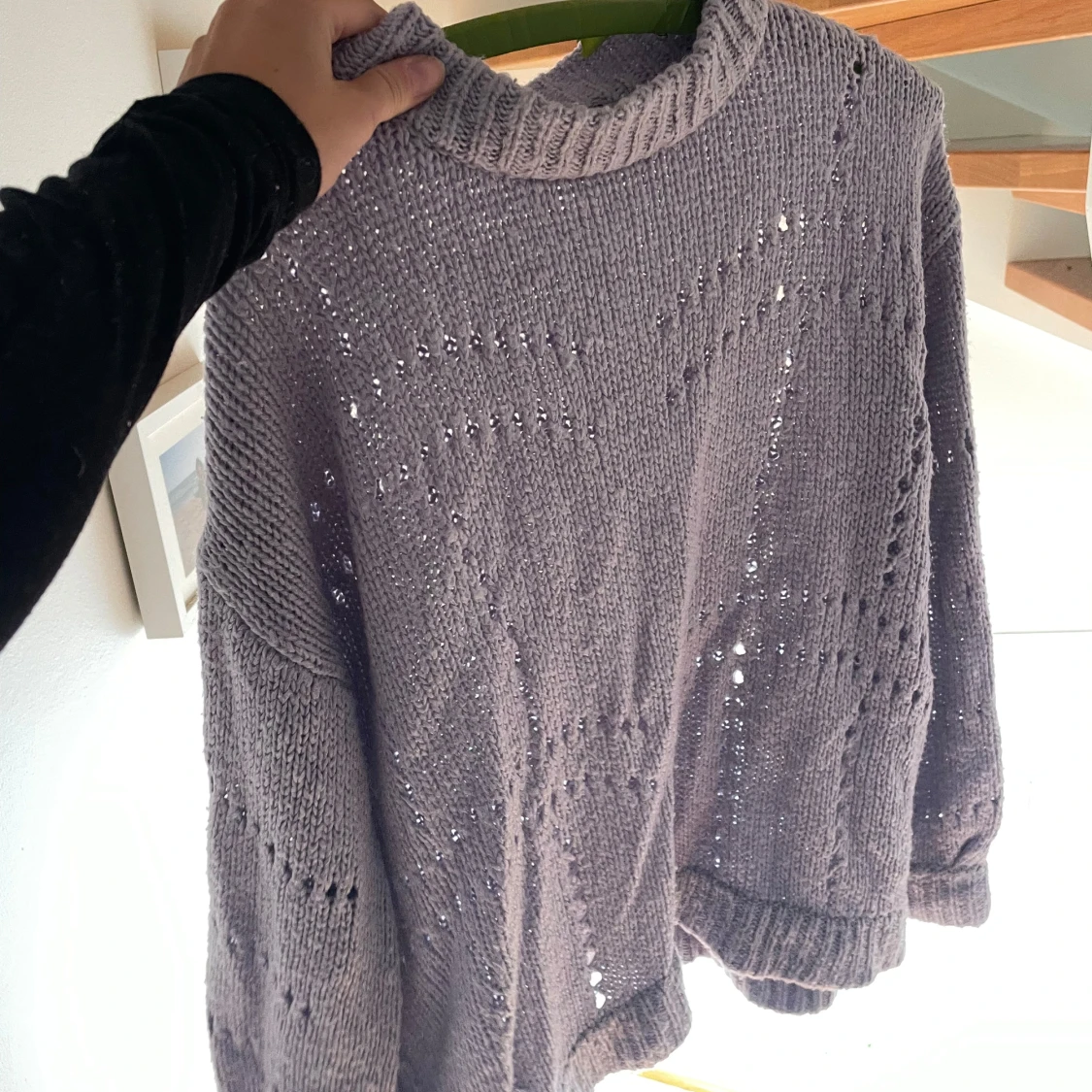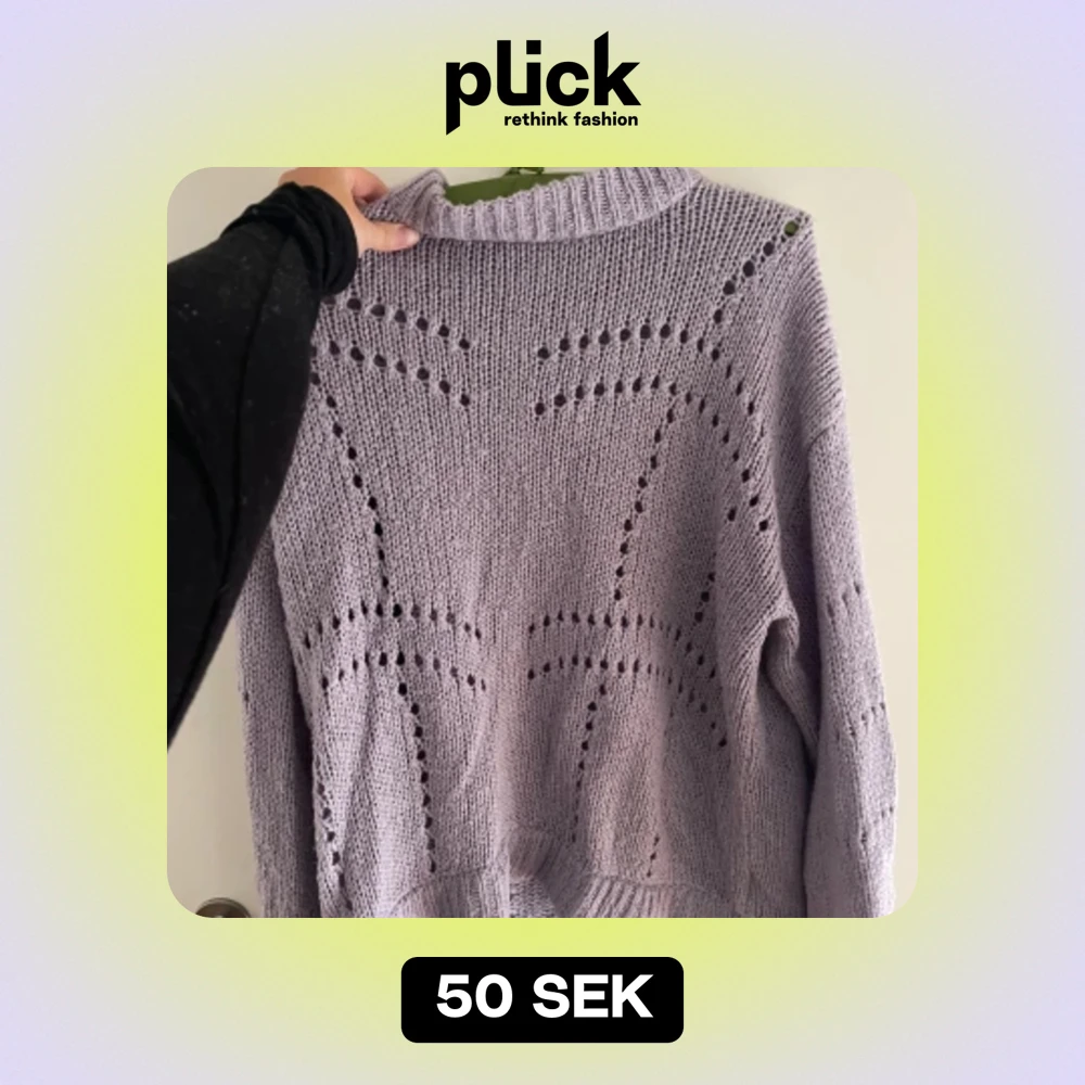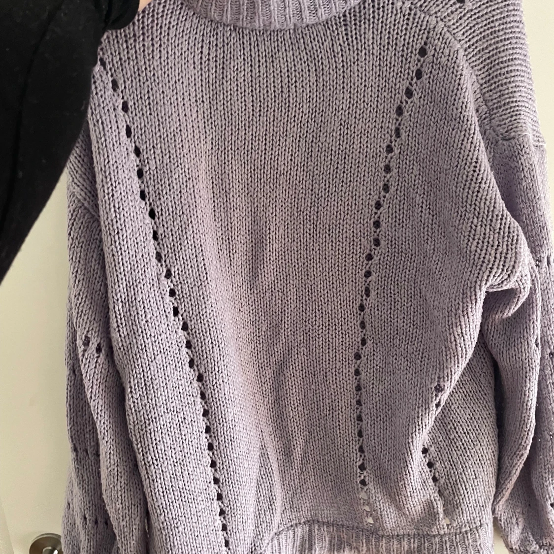 Säljer en superfin ljuslila stickad tröja med ett snyggt hålmönster. Tröjan har en hög krage och långa ärmar, perfekt för kyliga dagar. Den är både mysig och stilren, idealisk för höst och vinter.