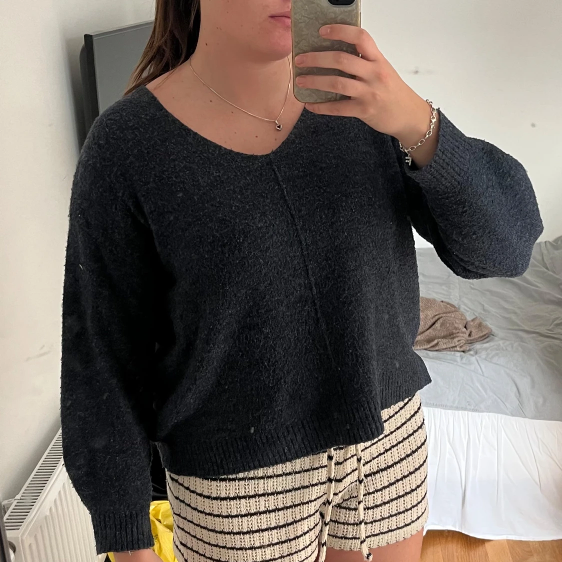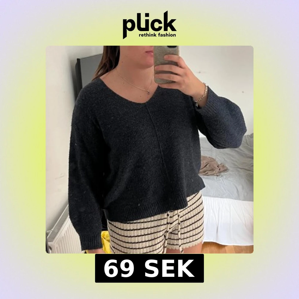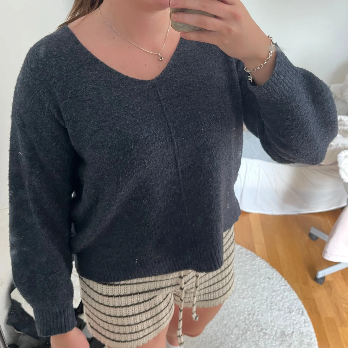 Säljer en mysig mörkblå stickad tröja med v-ringad hals och långa ärmar. Tröjan har en loose passform och ribbade muddar vid ärmslut och nederkant. Perfekt för dig som gillar enkel och chill stil. Den har använts en del men har fortfarande bra kvalitet!