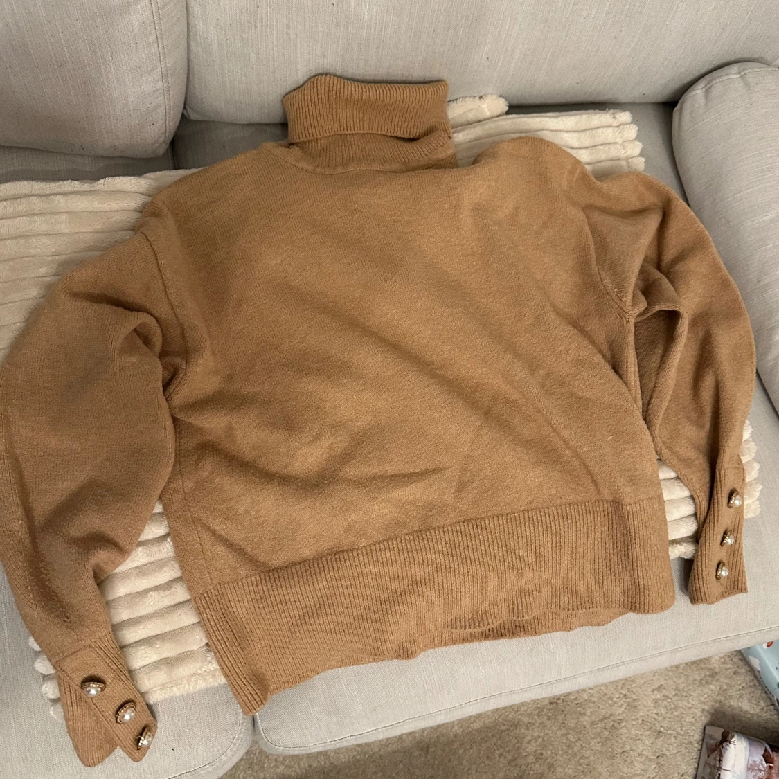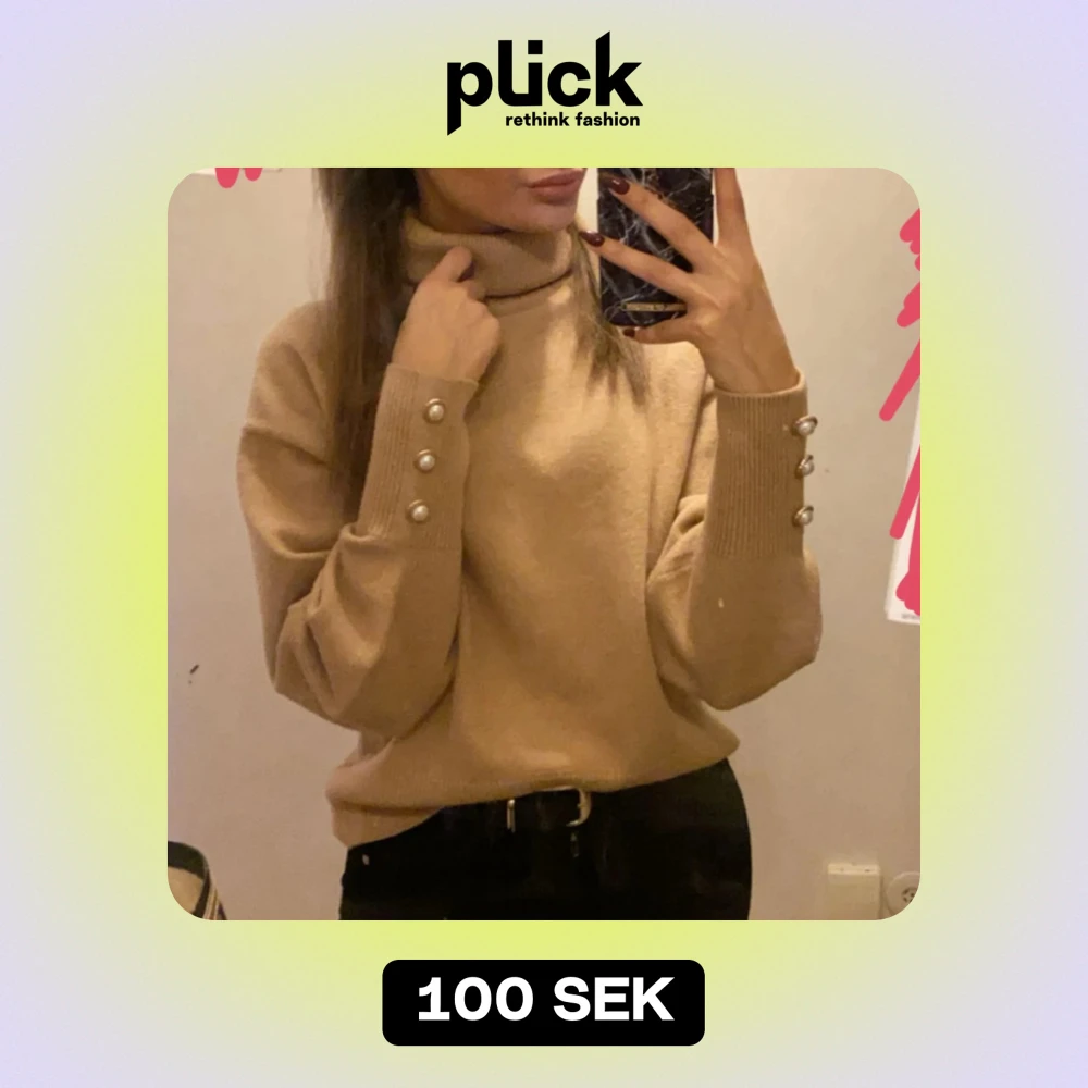 Säljer en stilren beige polotröja med långa ärmar och dekorativa pärlknappar vid ärmsluten. Perfekt för kyligare dagar och ger en elegant touch till din outfit.