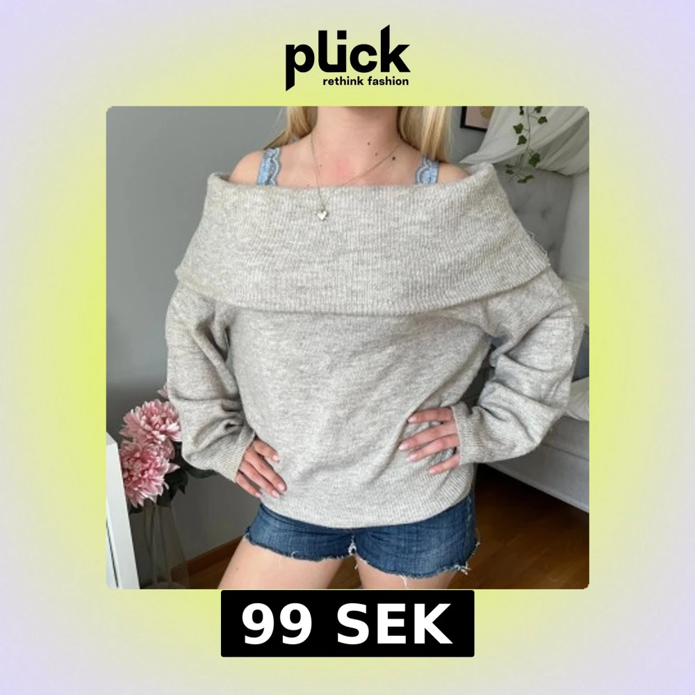 Supermjuk beige stickad tröja med bred offshoulder-krage. I jättefint skick och är i storlek xs!