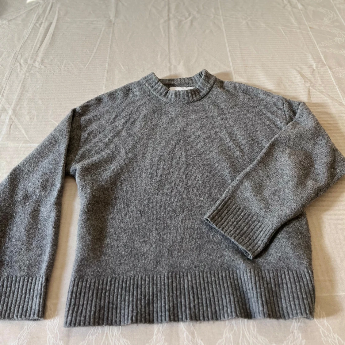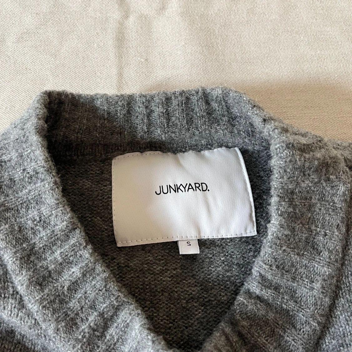 Säljer en stilren grå stickad tröja från Junkyard i storlek S men passar även M. Tröjan har långa ärmar och ribbstickade muddar vid ärmslut och nederkant. Perfekt för kyliga dagar. Hör av dig vid intresse!