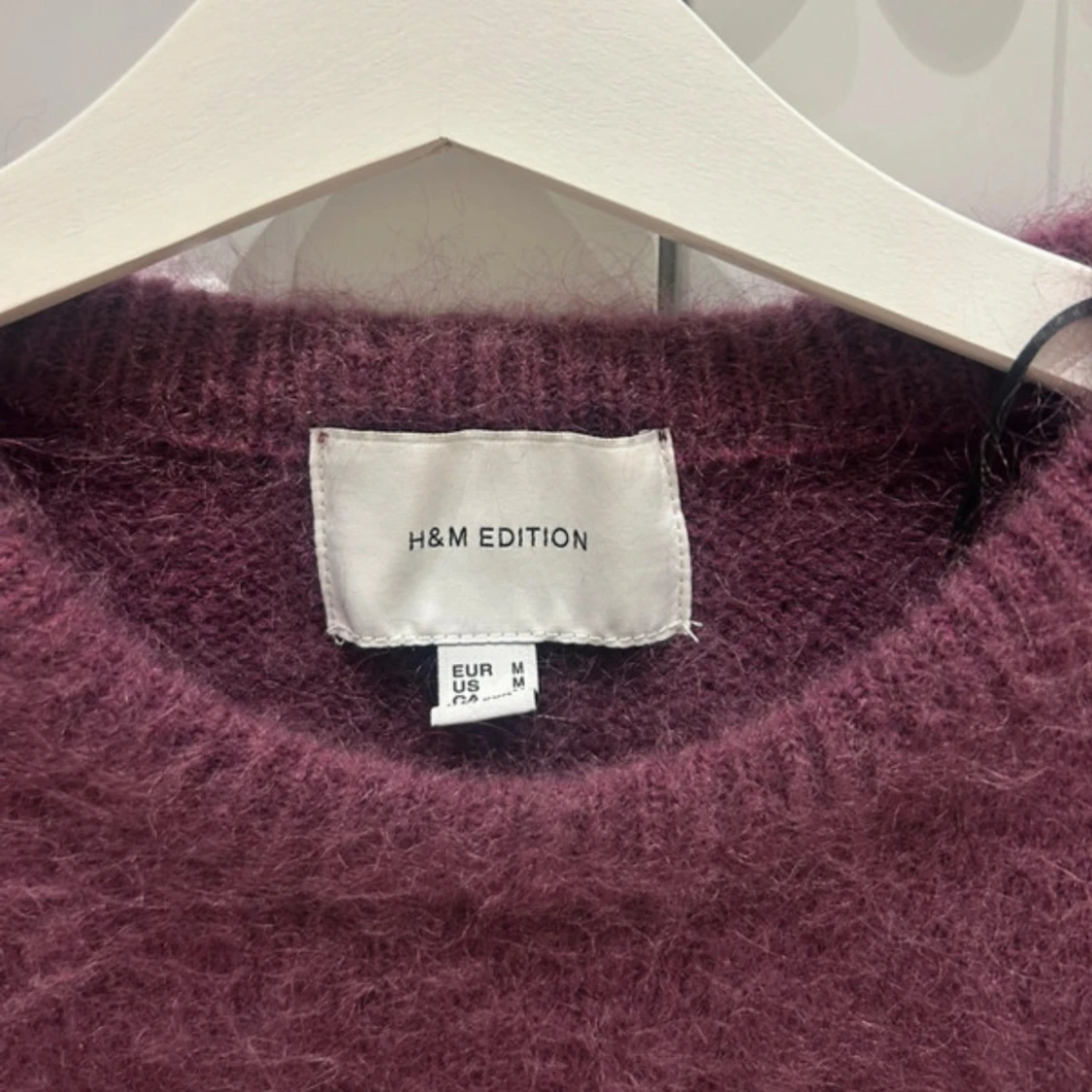 Supermjuk och fluffig lila stickad tröja från H&M Edition. Tröjan har en avslappnad passform, rund halsringning och halvlånga ärmar. Perfekt för lager-på-lager och ger en mysig vibe till din outfit.
