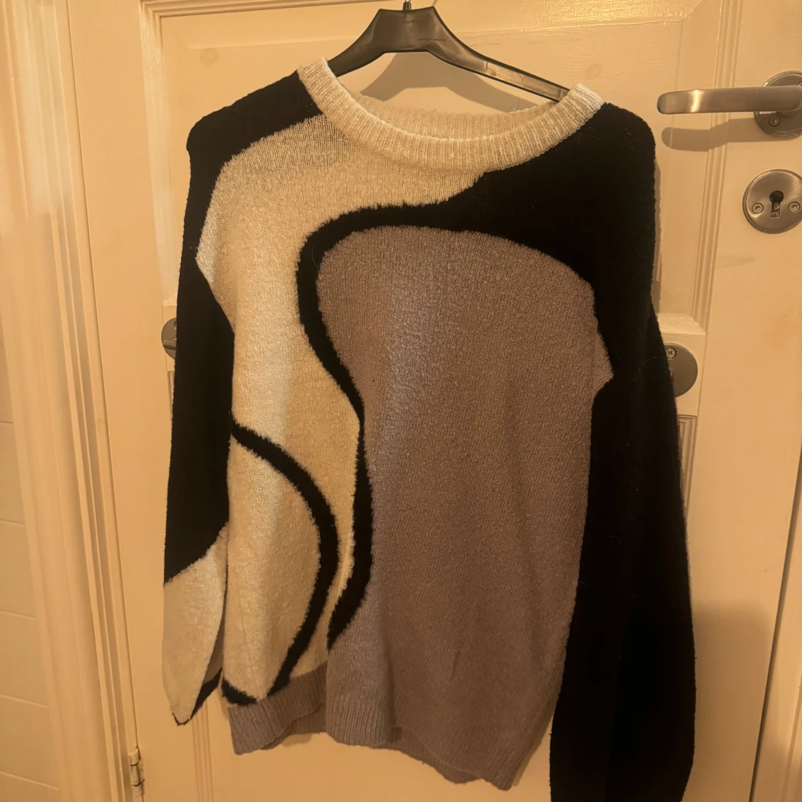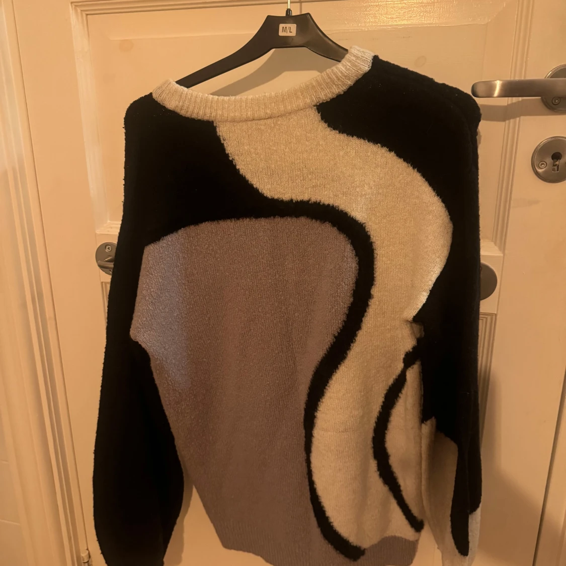 Säljer en skit snygg stickad tröja med abstrakt mönster i svart, grått och vitt. Tröjan har rund halsringning och långa ärmar. Perfekt för dig som gillar unika plagg med cool design och mjuk känsla.