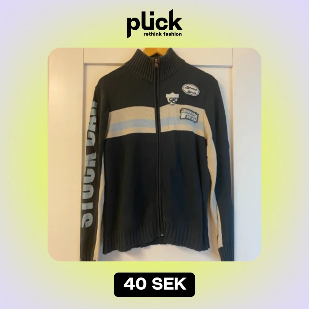 Stickad tröja med dragkedja stl L. Bra skick. Inga hål eller fläckar men är lite sliten i trycket på ärmen. 🌸 Vi tvättar parfymfritt, röker INTE men katt finns i hemmet sedan några veckor tillbaka.