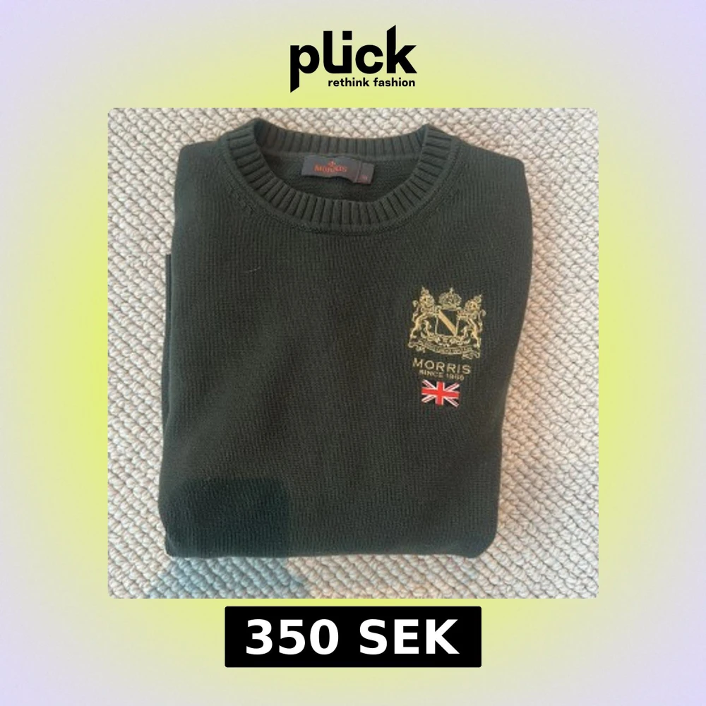 Snygg mörkgrön stickad tröja från Morris med broderat emblem och brittisk flagga på bröstet. Rund halsringning och ribbade muddar vid ärmslut och nederkant. Den är i 100% bomull. Tröjan är nvänd mycket men ändå i fint skick.