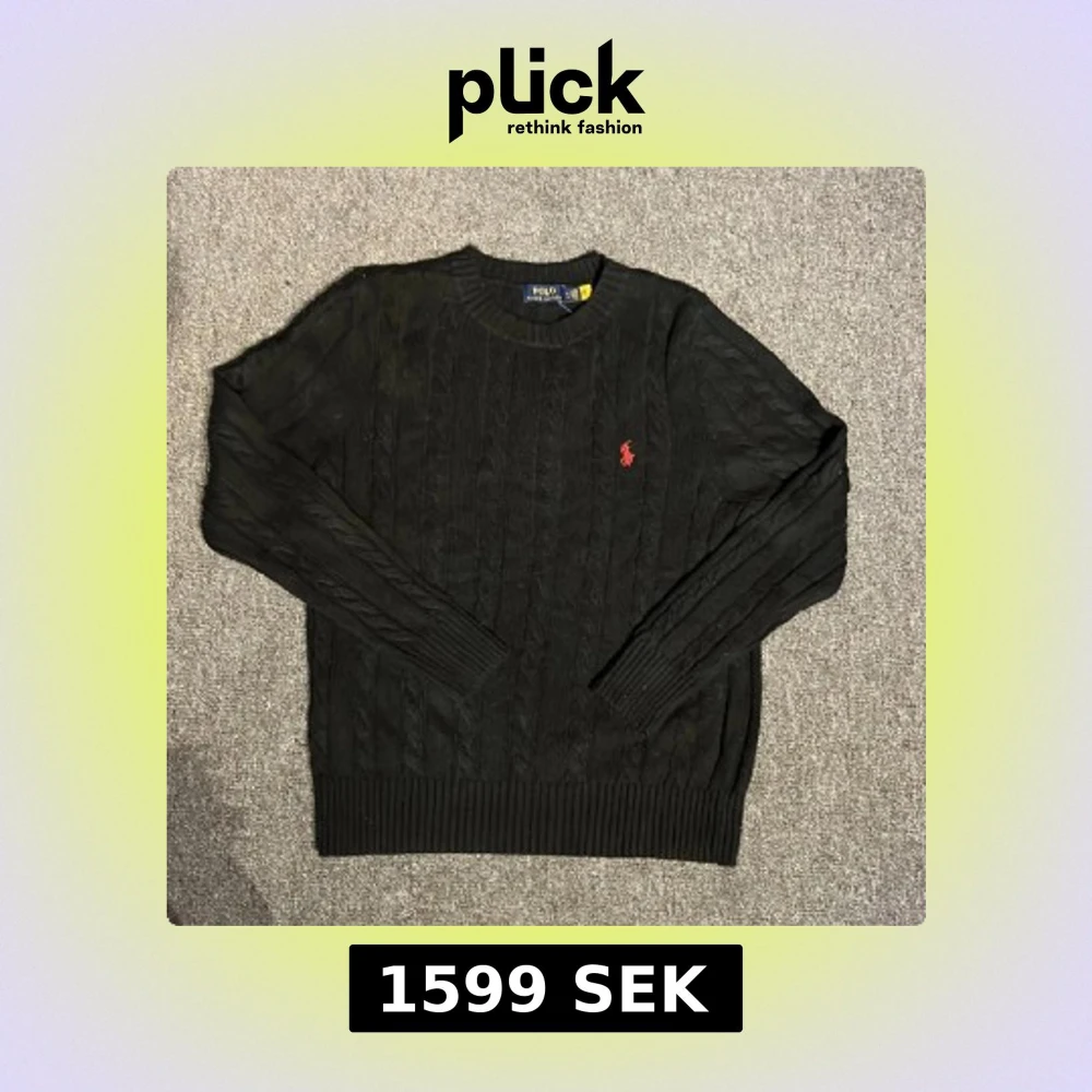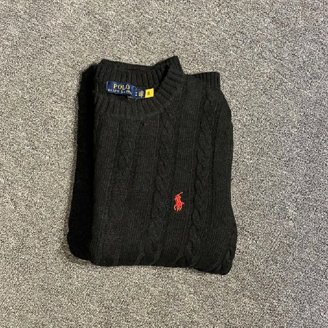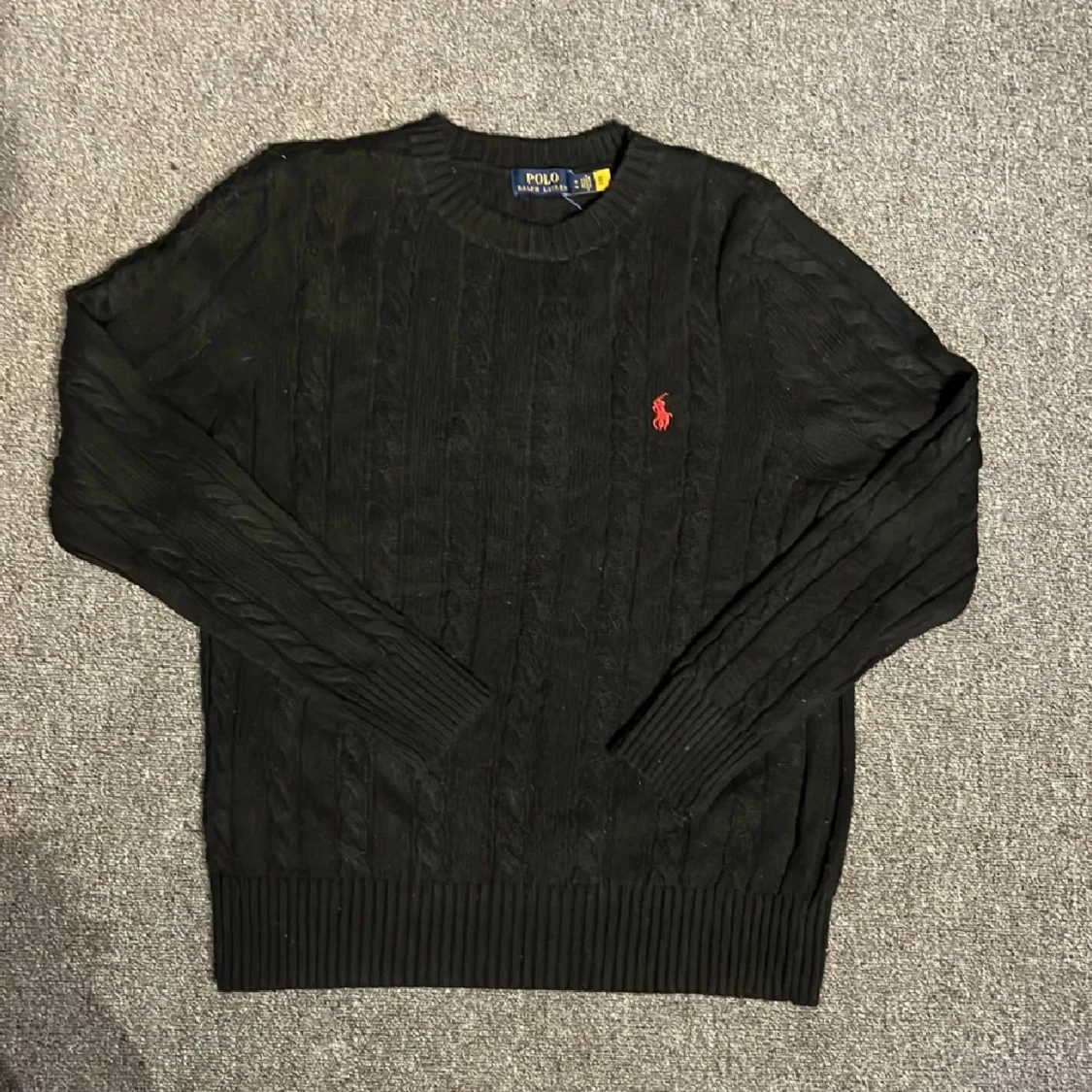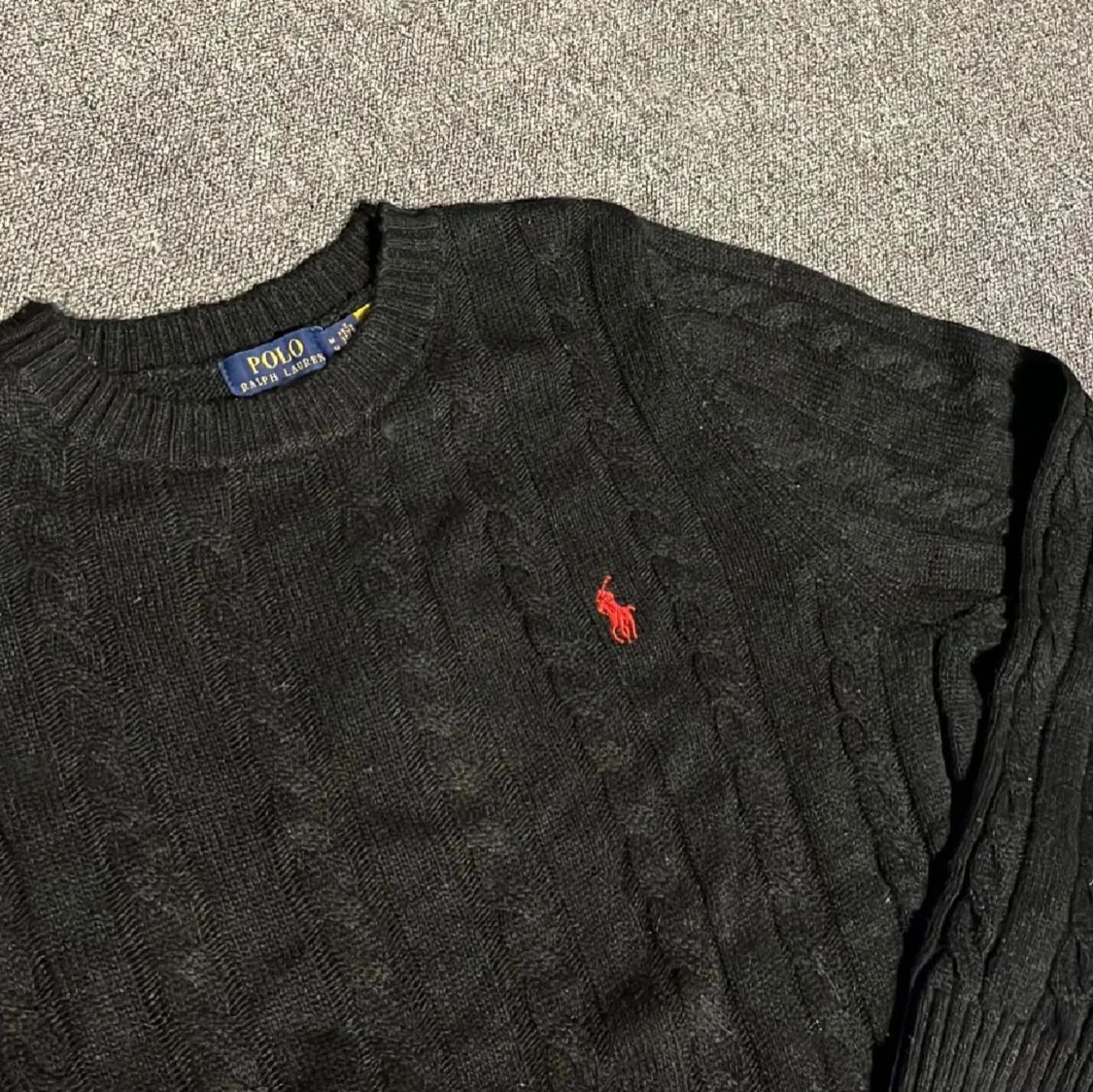 Svart kabelstickad tröja från Polo Ralph Lauren med klassisk rund halsringning och röd broderad logga på bröstet. Tröjan har långa ärmar och ribbade muddar för en snygg passform. Perfekt för dig som gillar stilren och tidlös design.