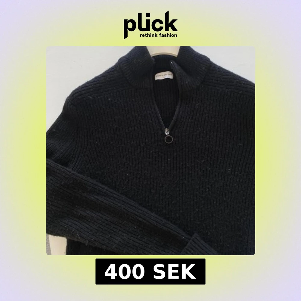 Svart stickad tröja från These Glory Days i storlek L. Tröjan har en hög krage och en snygg half zip-dragkedja med rund detalj. Ribbstickad struktur och långärmad modell, perfekt för kyliga dagar.