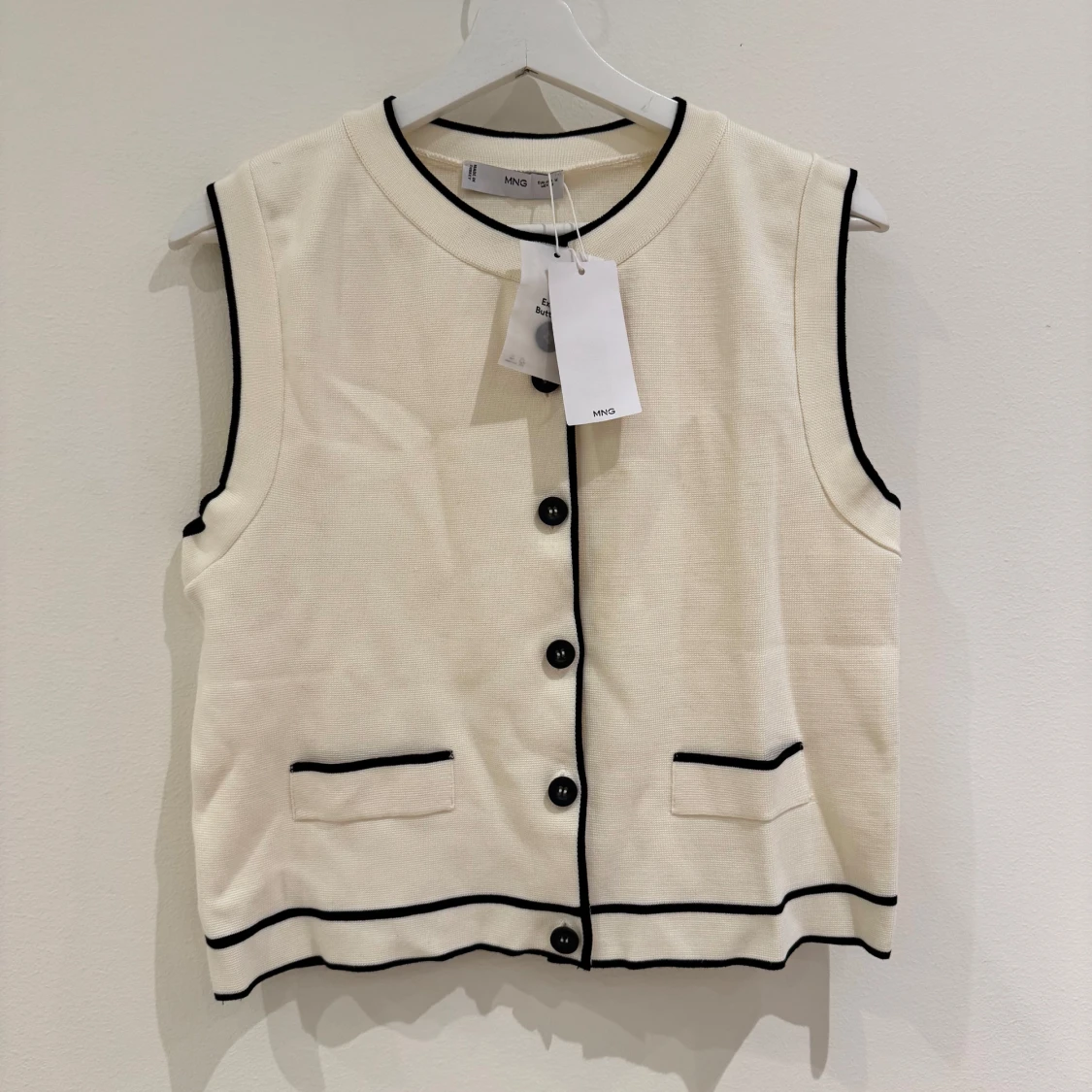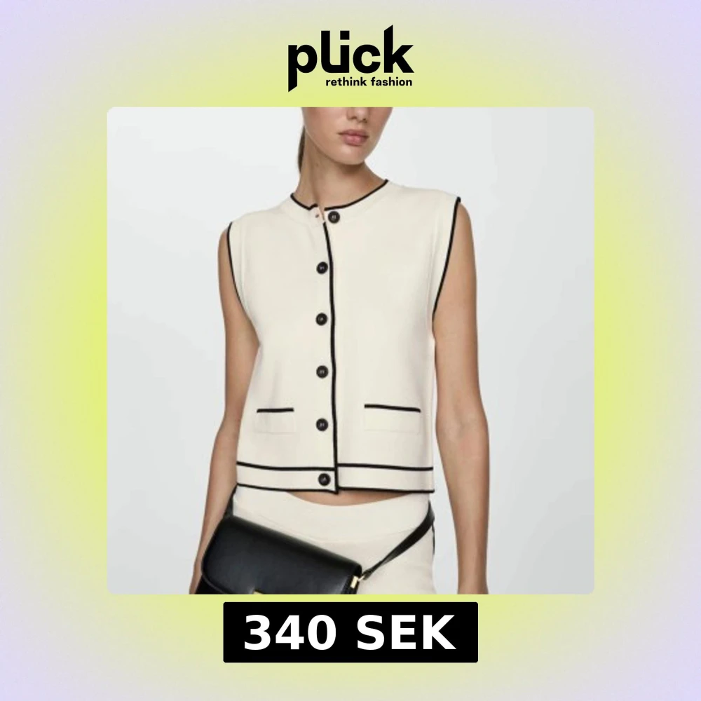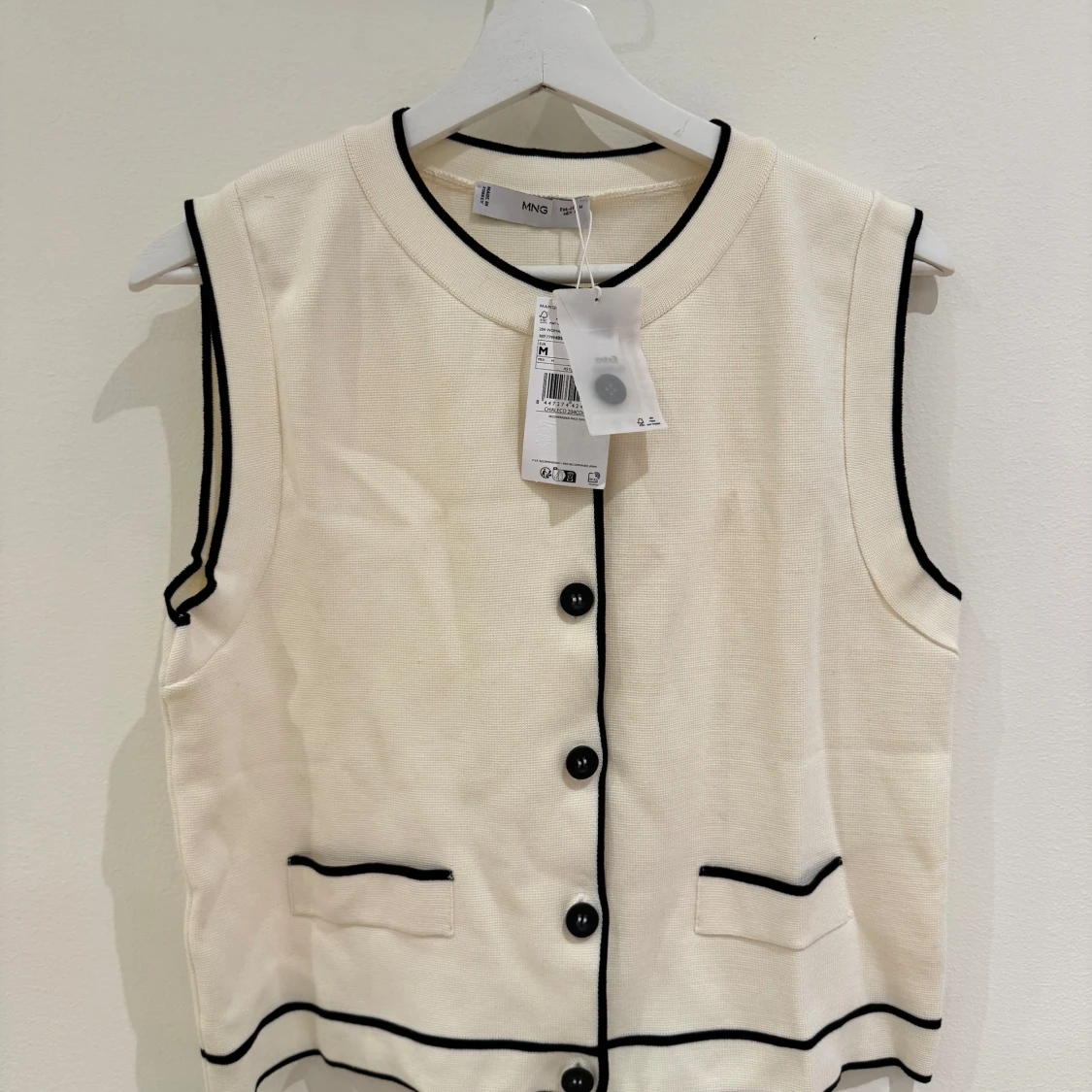 Stilren vit väst med svarta kanter och knappar framtill. Västen har två dekorativa fickor och en rak passform. Perfekt för att lyfta en enkel outfit med en klassisk touch. NYPRIS 420kr, storlek M🥰