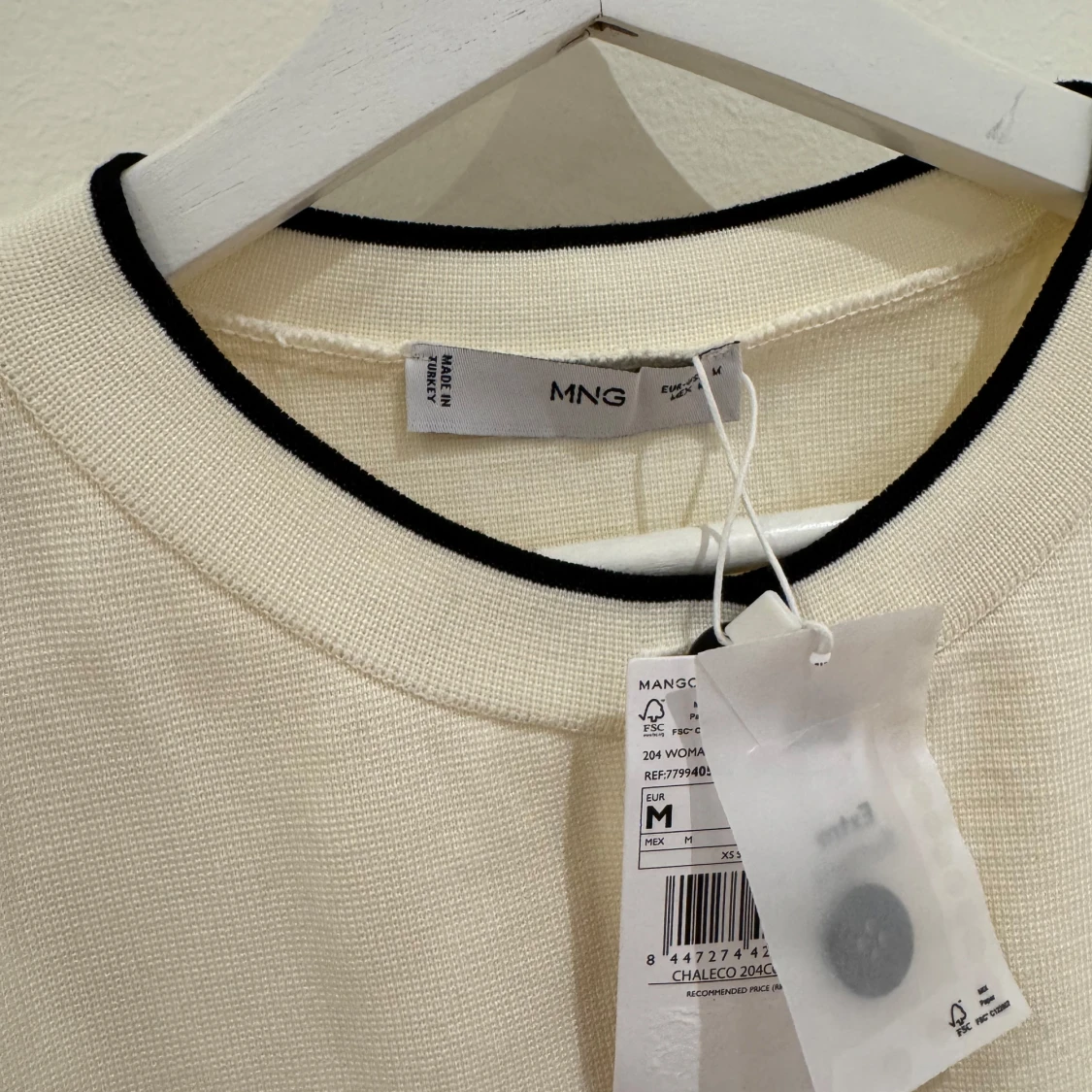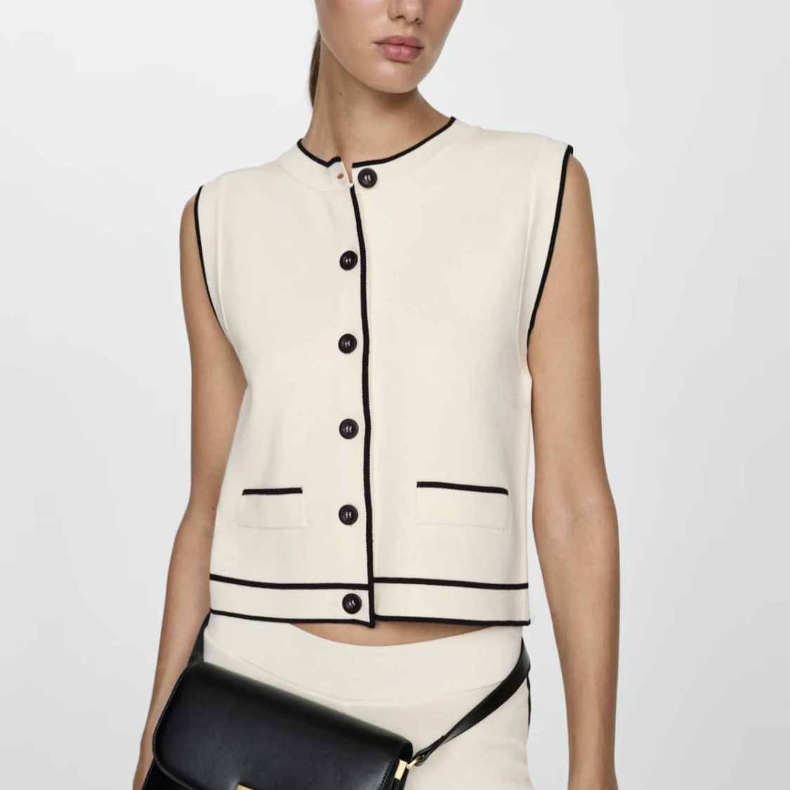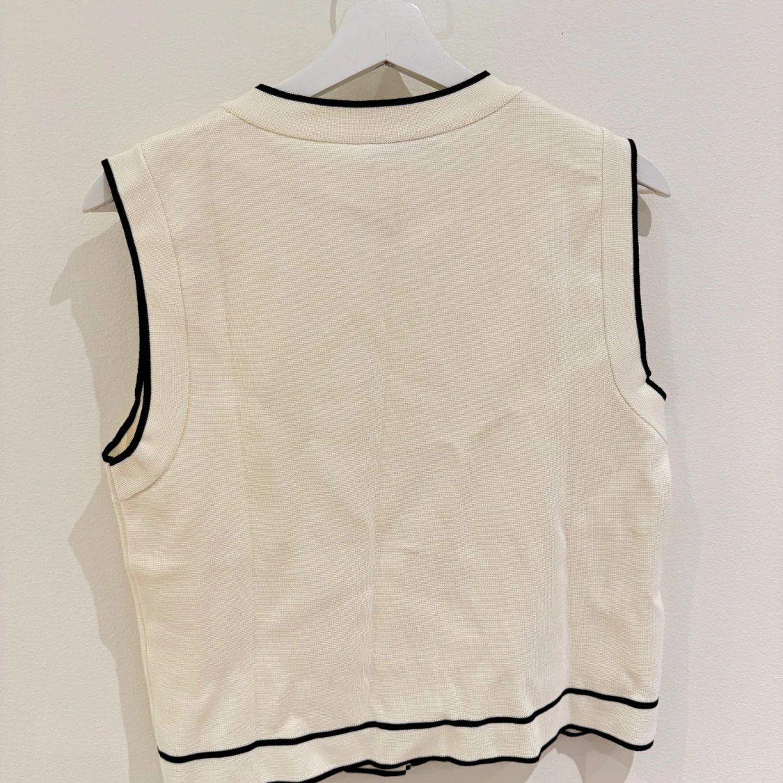 Stilren vit väst med svarta kanter och knappar framtill. Västen har två dekorativa fickor och en rak passform. Perfekt för att lyfta en enkel outfit med en klassisk touch. NYPRIS 420kr, storlek M🥰