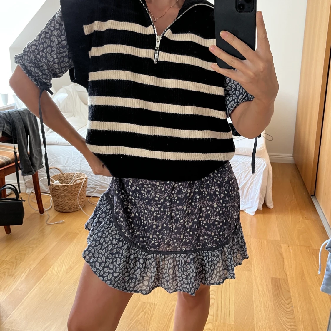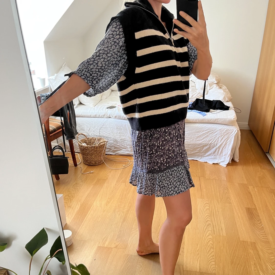 Stickad väst med svartvita ränder och dragkedja. Storlek S. Bra skick! DMa om du vill köpa flera kläder!