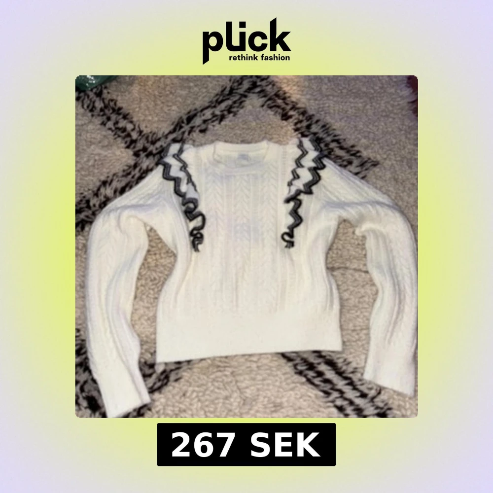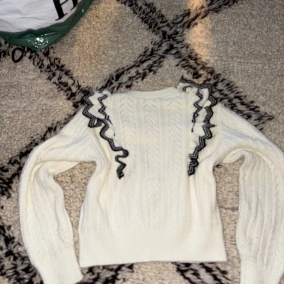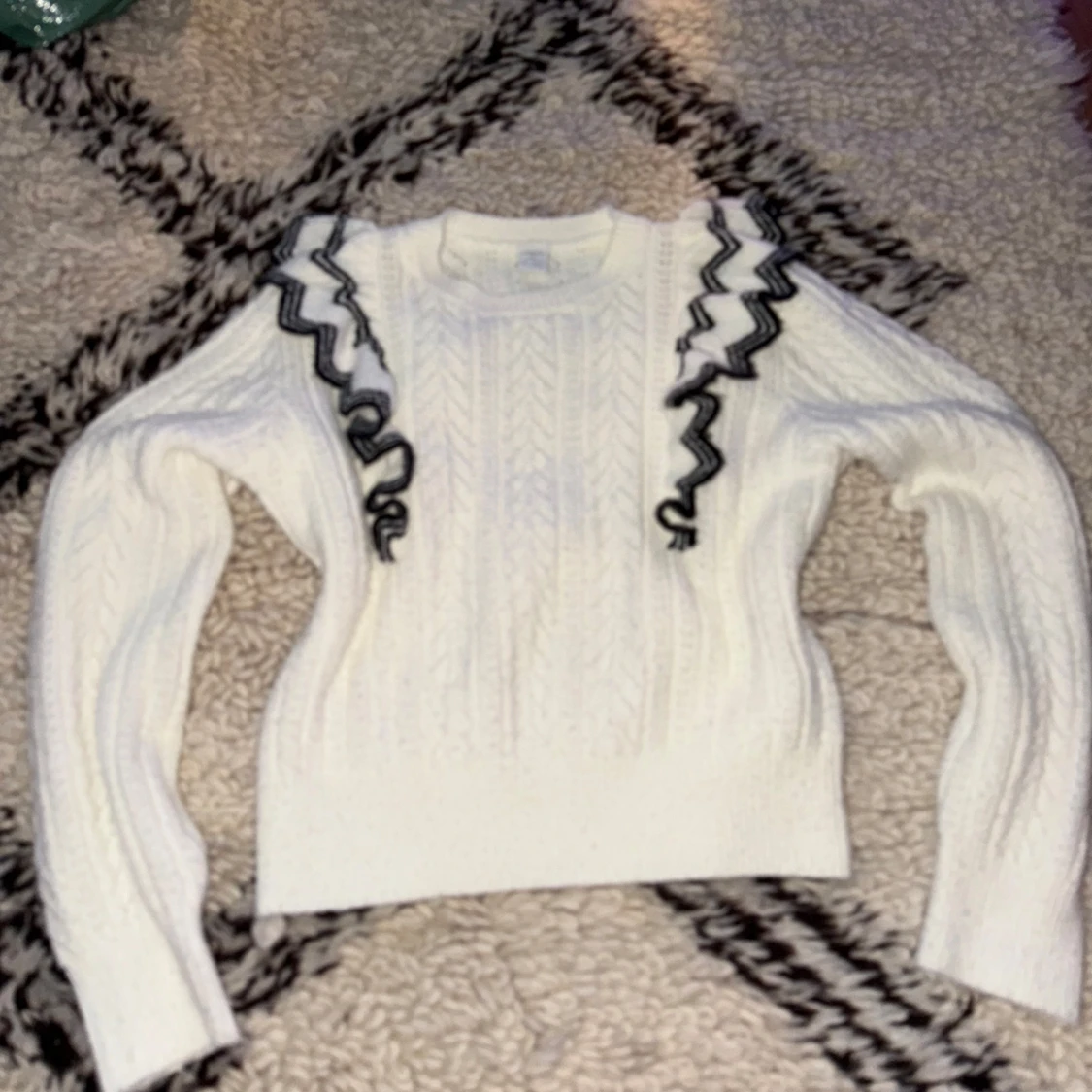 Stickad vit tröja med svart/vita volanger. Bra skick i storlek: S