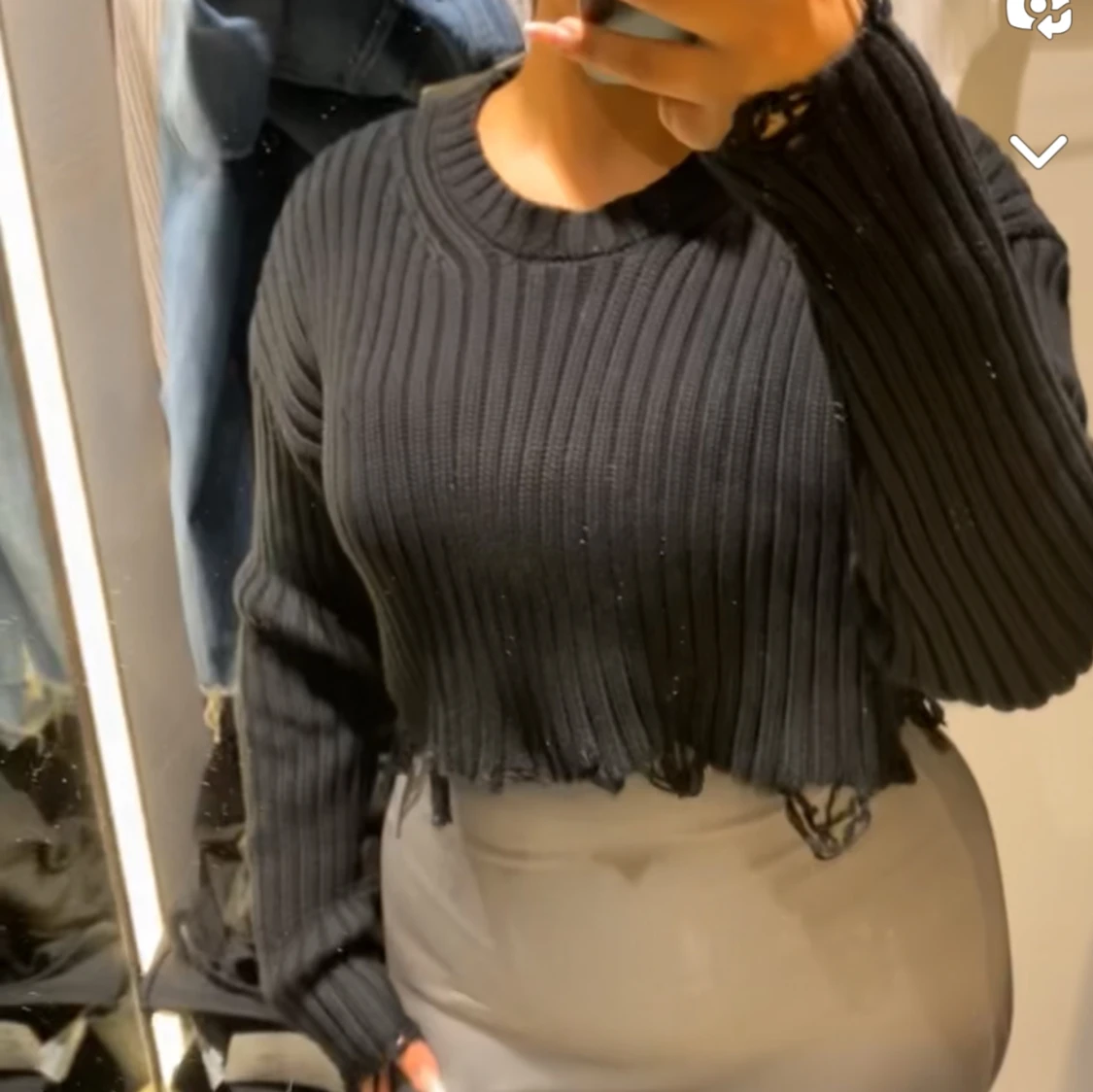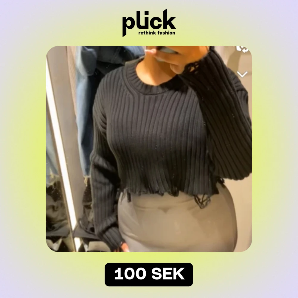 En svart tröja kort och fin från zara storlek M och den är stickad och har sånna hål band vid armarna och runt magen 💞