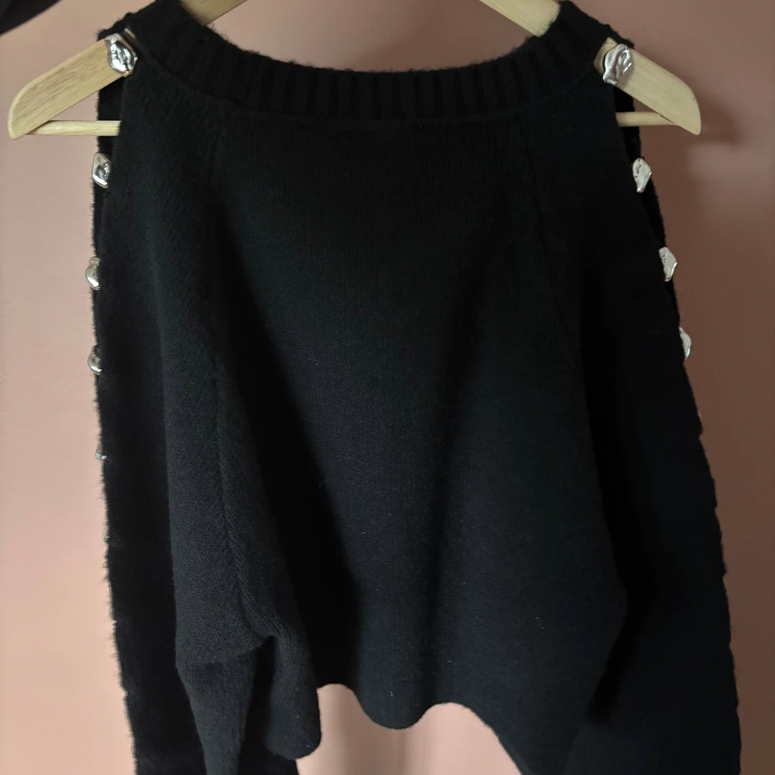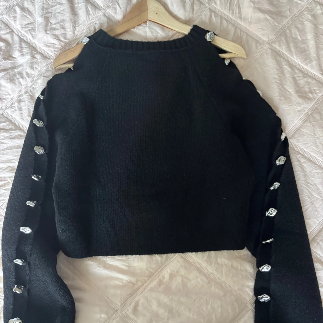 Svart stickad tröja med coola silverfärgade knappar längs axlar och ärmar. Tröjan har en croppad passform och långa ärmar. Perfekt för dig som vill ha en unik detalj i din outfit. Aldrig använt! Slutsåld på Zara!