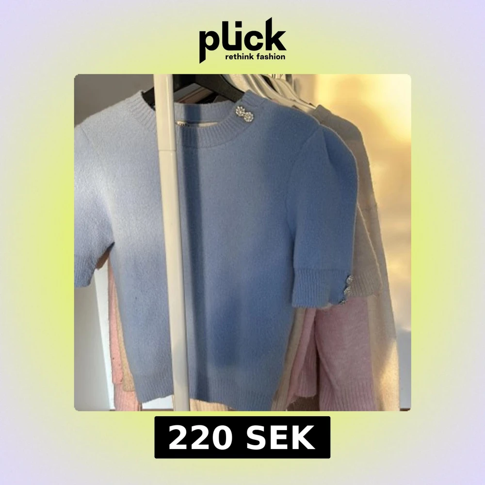 Superfin ljusblå stickad tröja från Zara med korta ärmar och glittriga dekorationsknappar vid axeln och ärmslutet. Tröjan har ribbade muddar och en klassisk rund halsringning. Tröjan är som ny och i storlek M, dock ganska liten i storleken