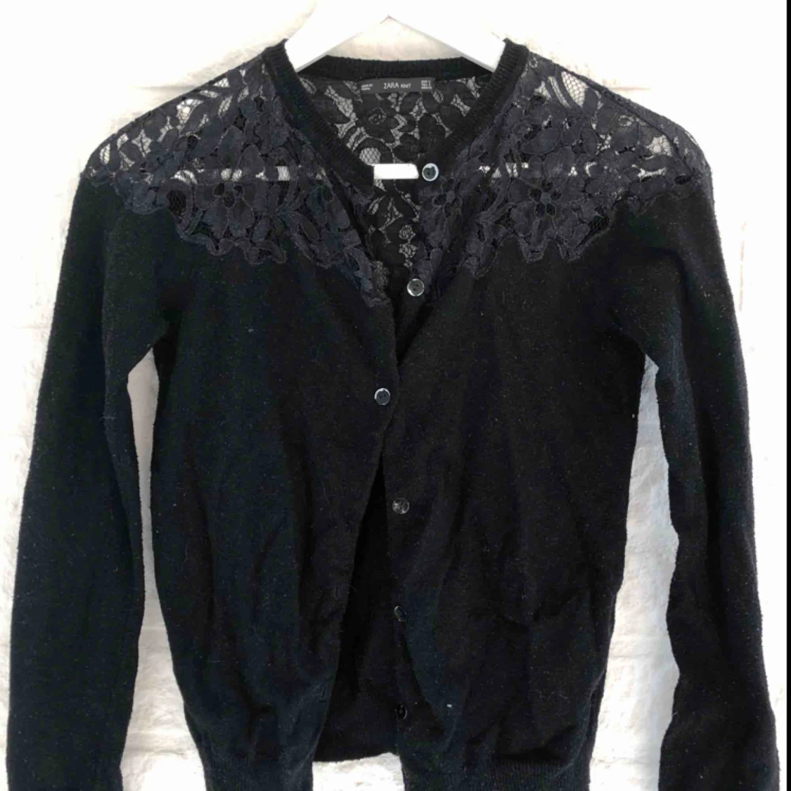 Svart tunn kofta från Zara med spetsbrodyr upptill. Delvis nopprig och avskalad färg på knapparna men varm i material. Storlek S men passar även XS. Frakt tillkommer