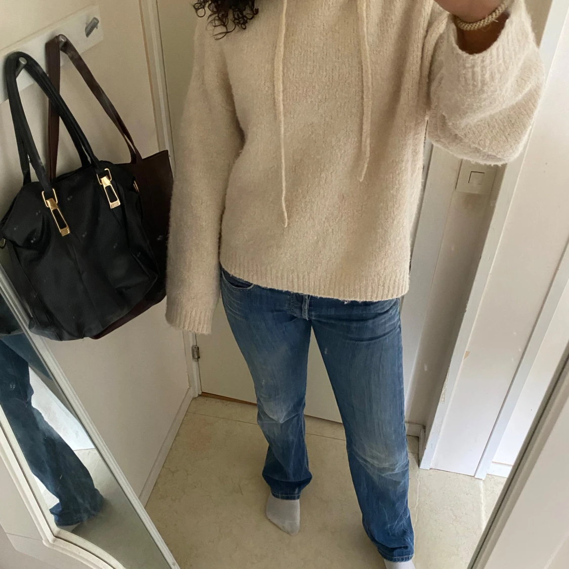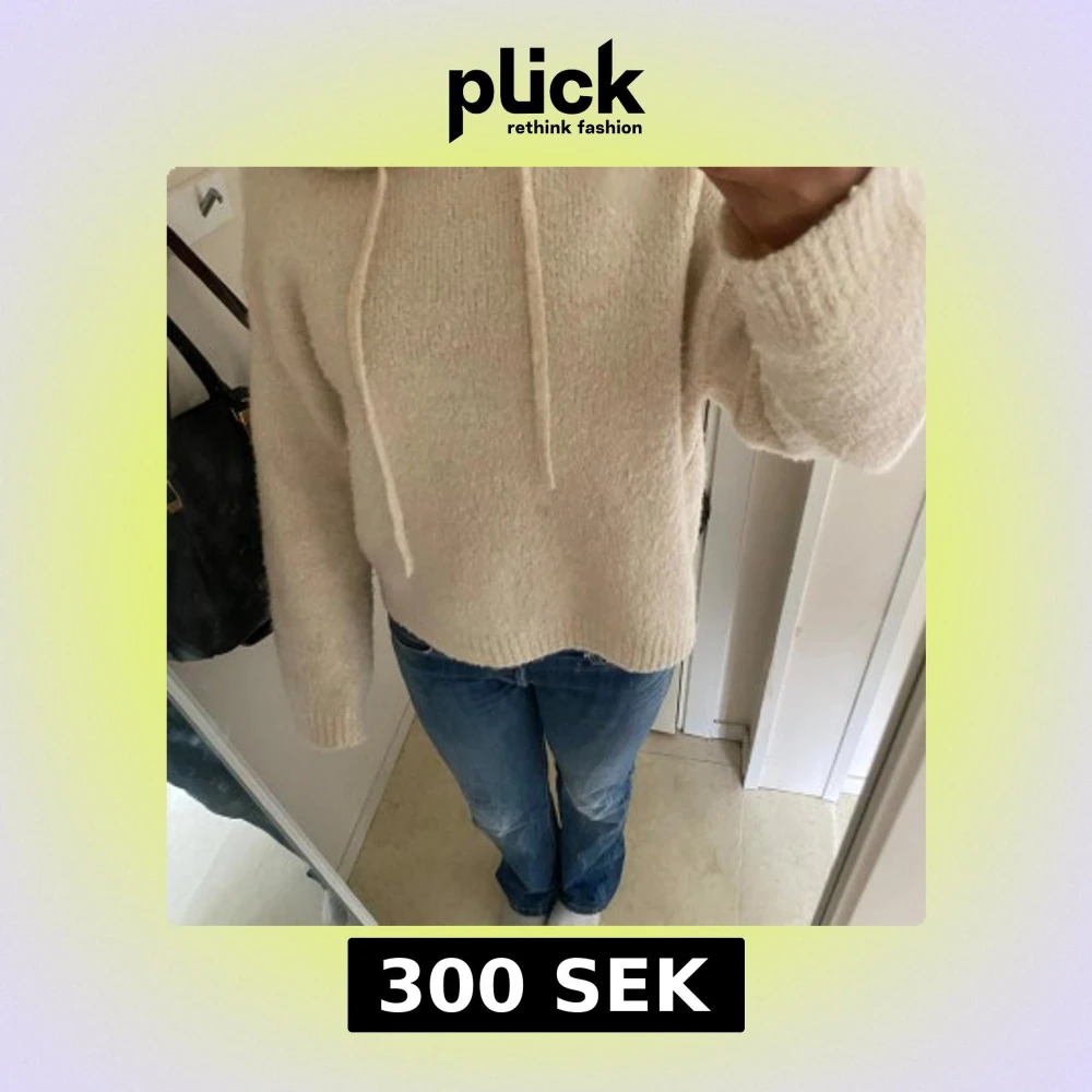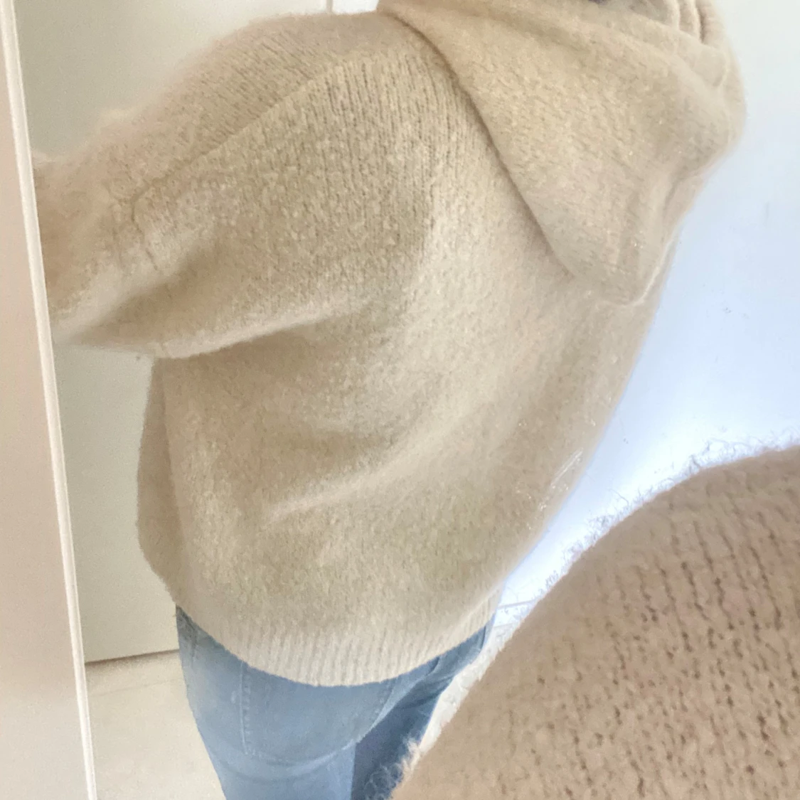 Mysig beige stickad hoodie med huva. Tröjan har lång ärm och en avslappnad passform.