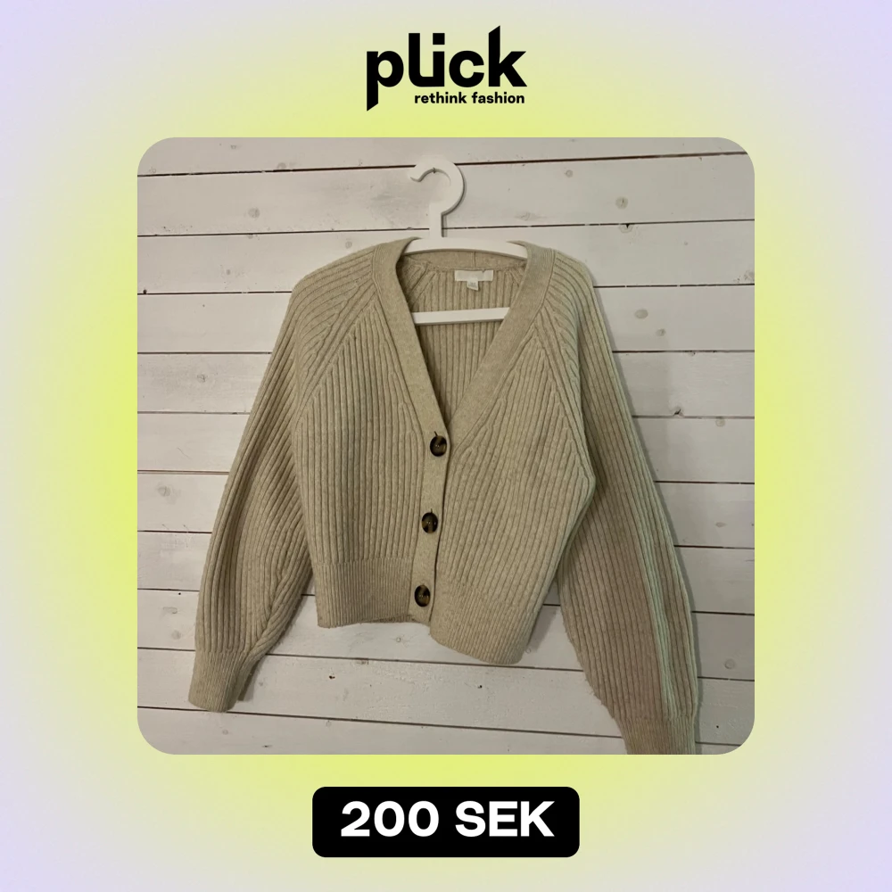Säljer en superfin beige kofta från hm med ribbad struktur och stora knappar framtill. Den har en v-ringad design och långa ärmar. Koftan är i bra skick då den knappast är använd!