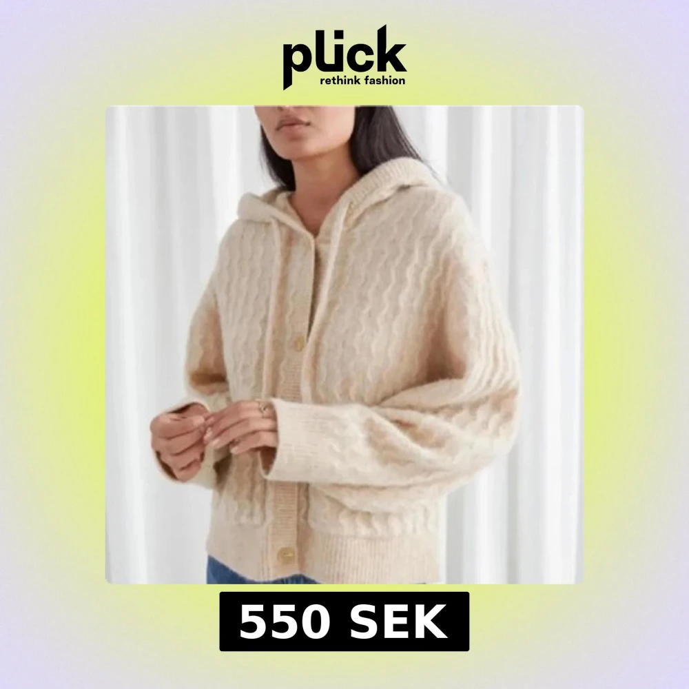 Mysig beige stickad kofta med huva och knappar framtill. Den har ett vågigt mönster och praktiska fickor.
