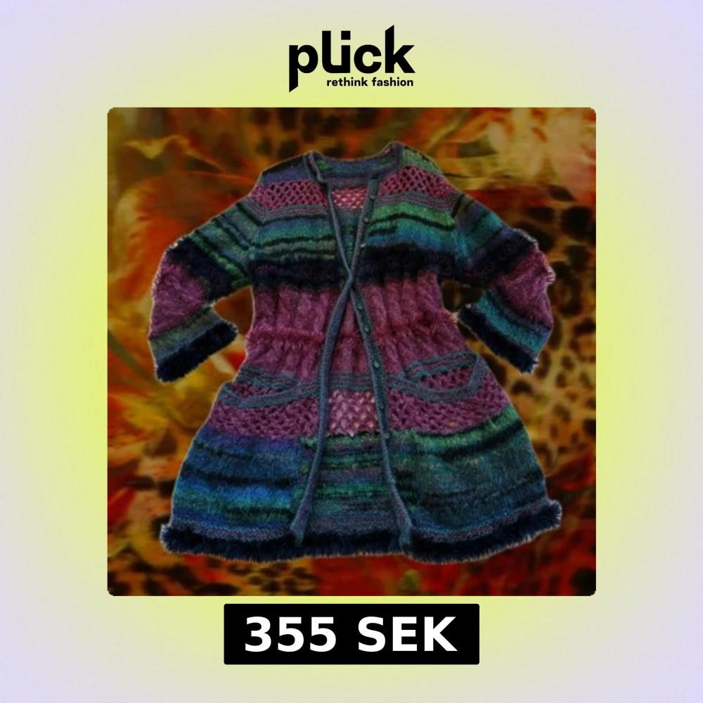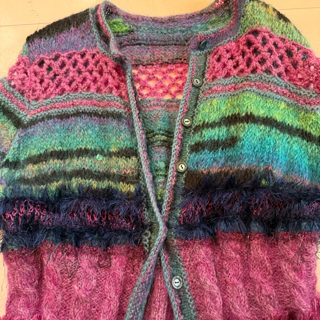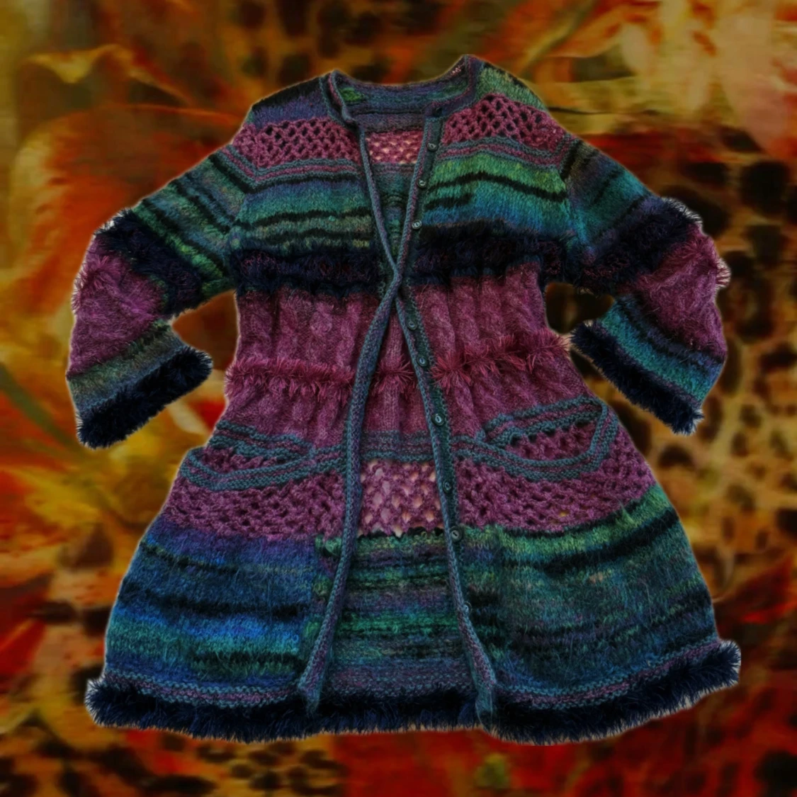 Unik och färgstark stickad kofta i lila, blått och grönt med coola mönster och fluffiga detaljer. Koftan har knappar framtill, två fickor och lång ärm. Perfekt för dig som vill sticka ut och älskar bohemiska vibes.