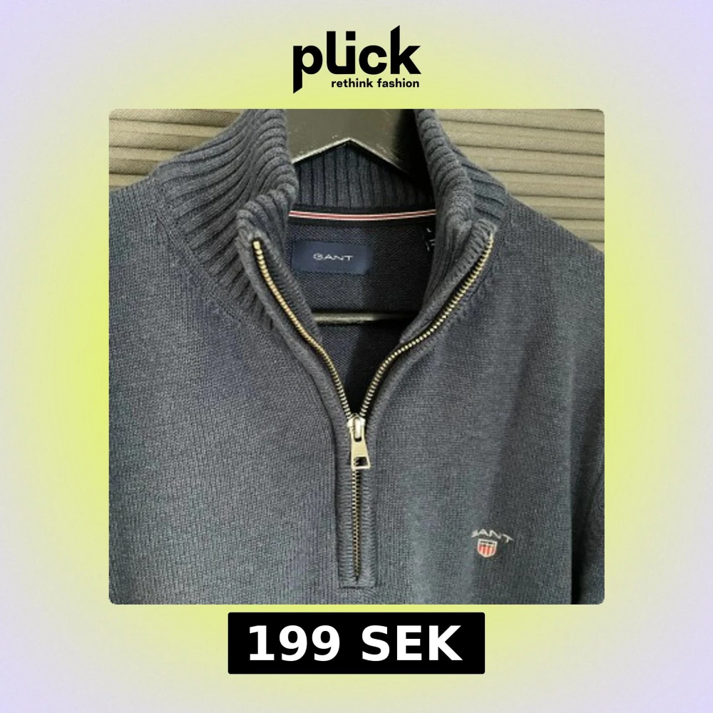 Säljer en marinblå stickad tröja från GANT med halv dragkedja och hög krage. Tröjan har ribbade muddar och GANT-logga broderad på bröstet. Mycket bra skick använd fåtal gånger