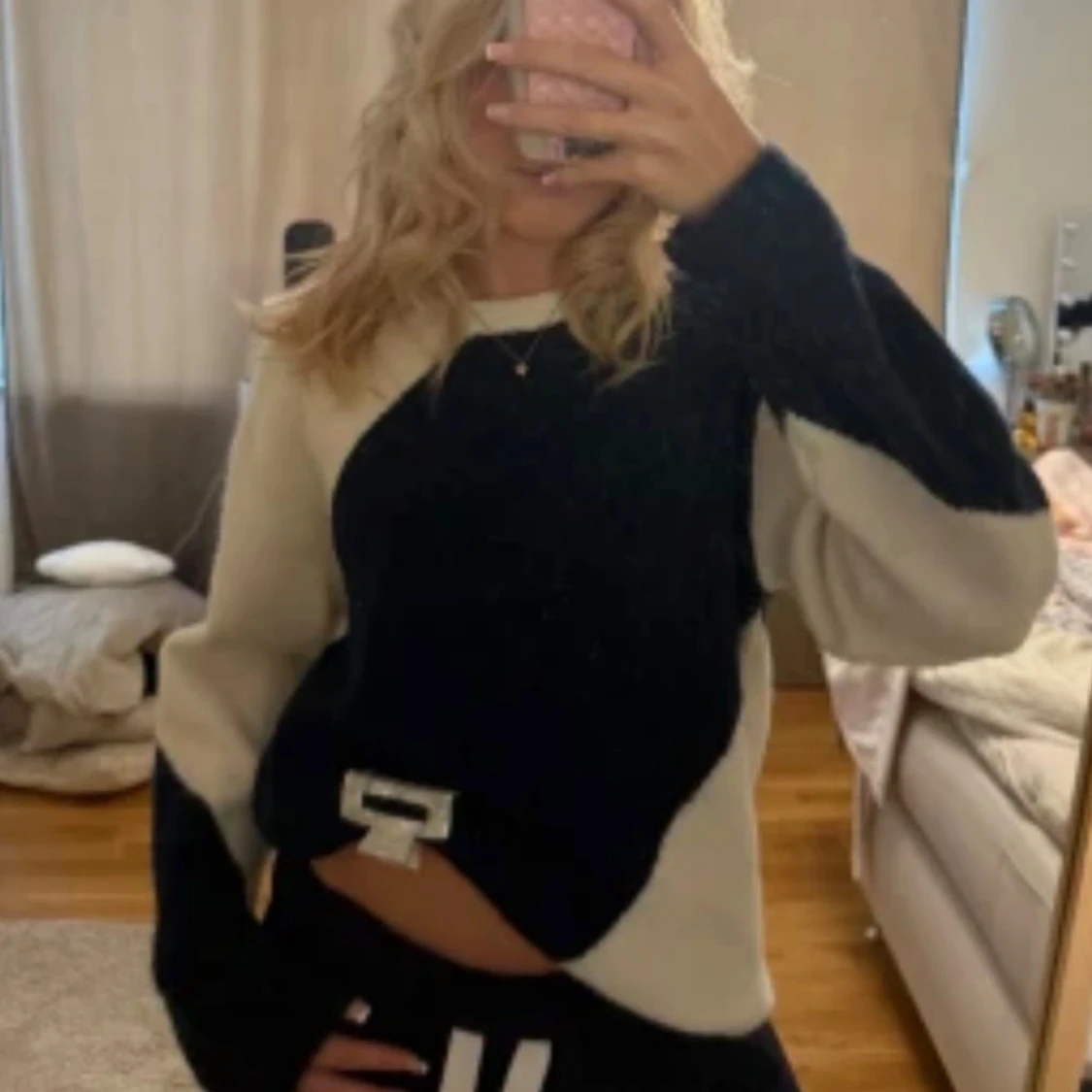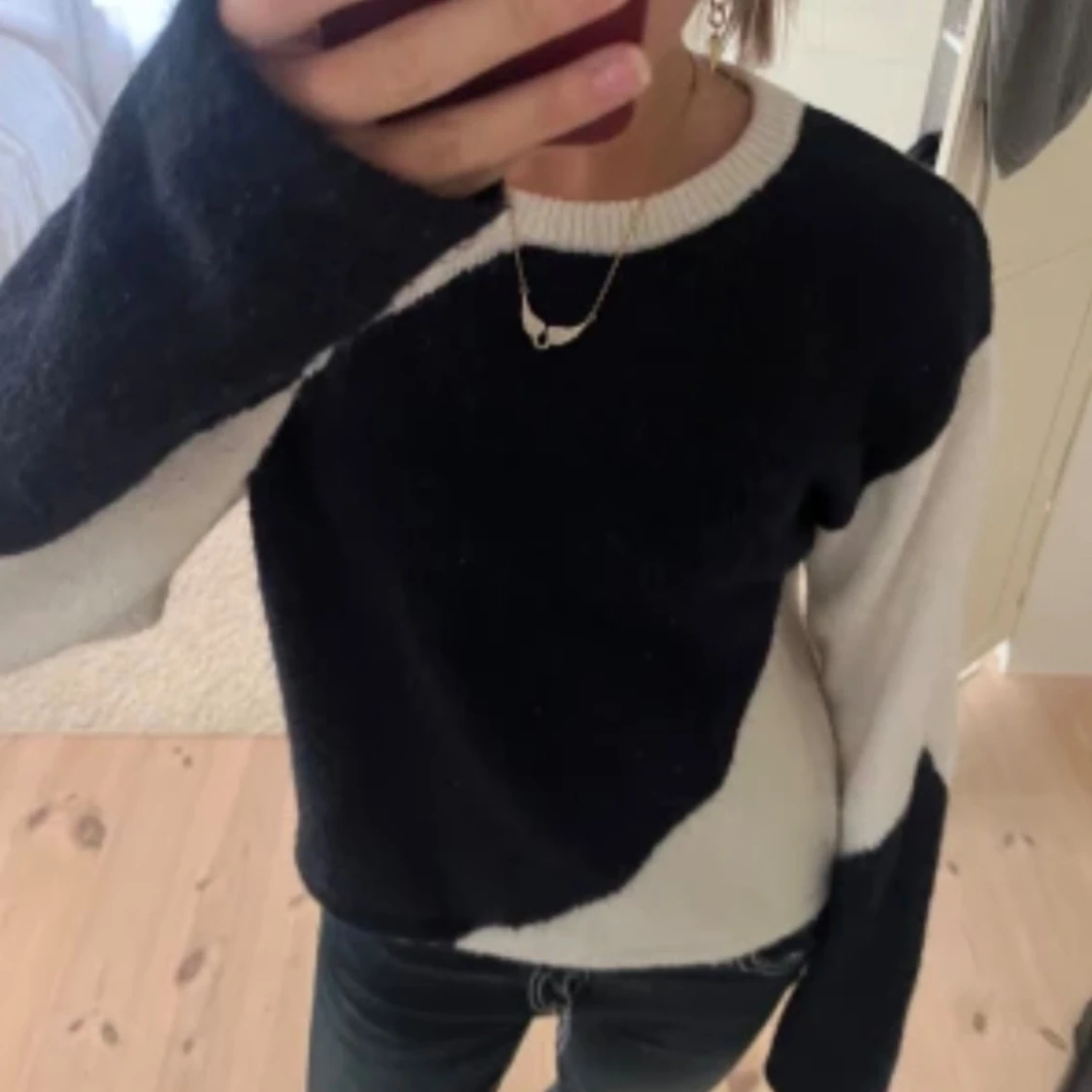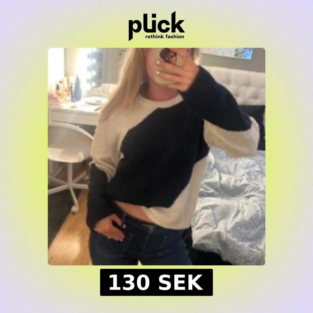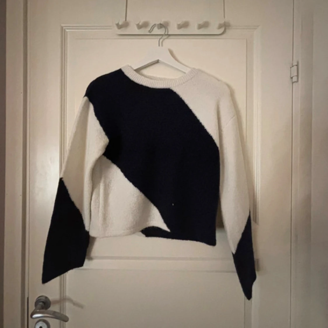 Säljer en snygg stickad tröja med, asymmetriskt mönster. Tröjan har rund hals och långa ärmar. Köpt på vinted men tyckte men använde den aldrig efter det. Kan ha lite noppror men absolut inget man tänker på. Helt slutsåld!