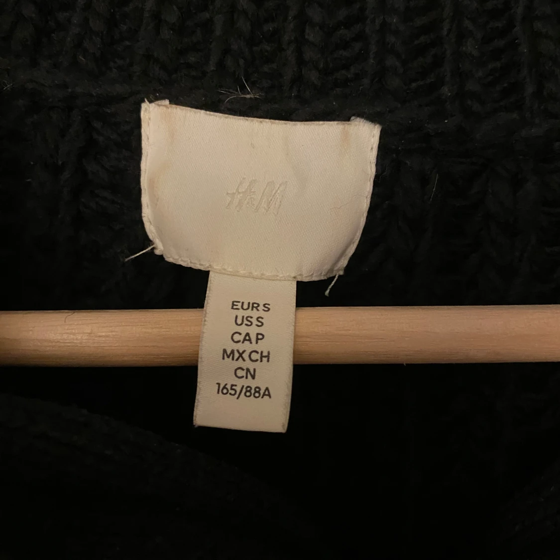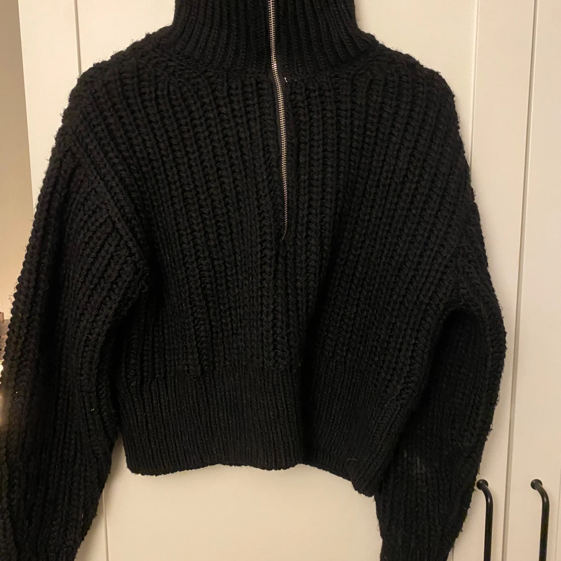 Säljer en svart stickad tröja med dragkedja och hög krage. Tröjan har en oversized passform och långa ärmar.