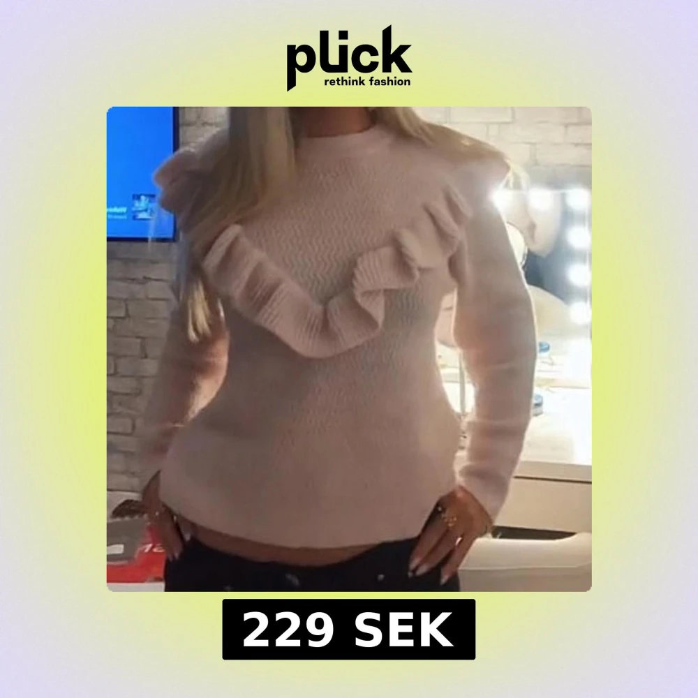 Supersöt ljusrosa stickad tröja med volangdetalj som går över bröstet och axlarna. Storlek 146/152 som uppskattas till storlek XS och passar även S ifall man vill ha den tajtare. Använd bara 2 gånger!! 💕
