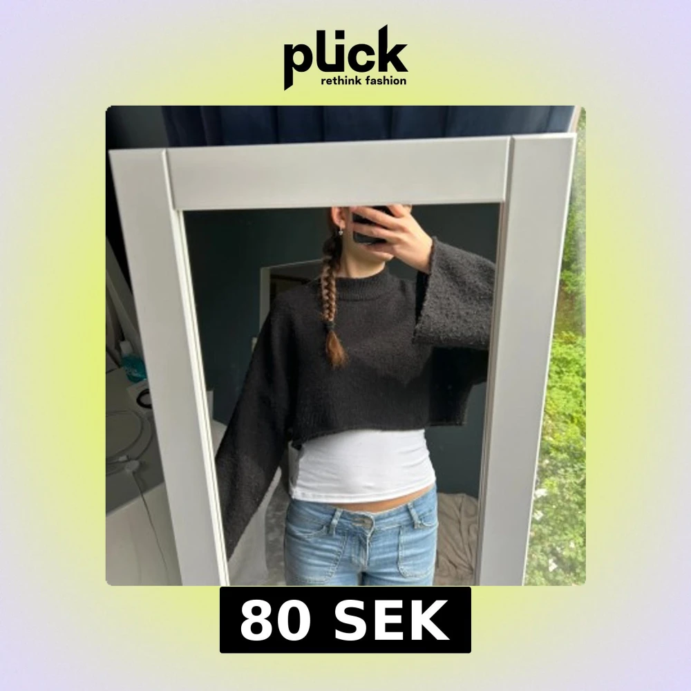 Säljer en svart croppad stickad tröja med vida, långa ärmar och hög hals. Tröjan har en loose passform och är perfekt för dig som gillar en chill och trendig stil. Passar snyggt över ett linne eller t-shirt och funkar året runt. Storlek M men jag har vanligtsvis S