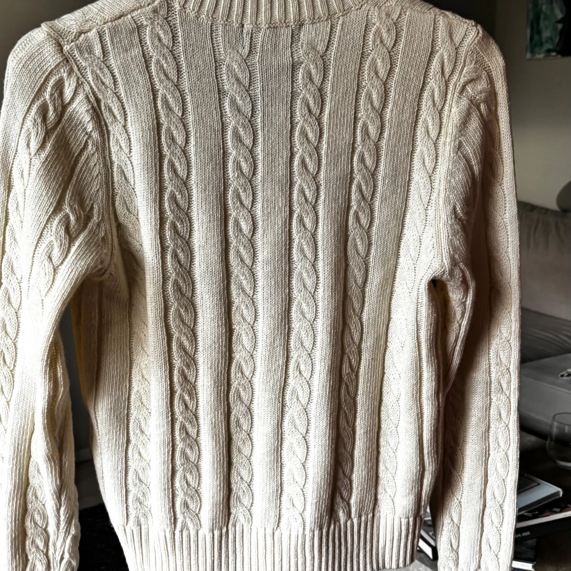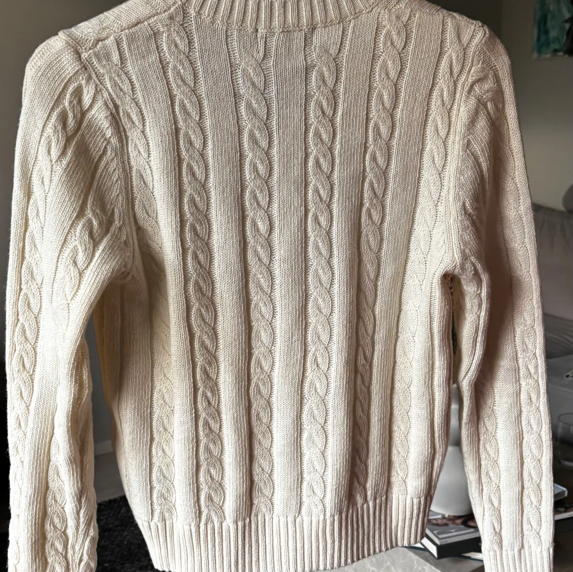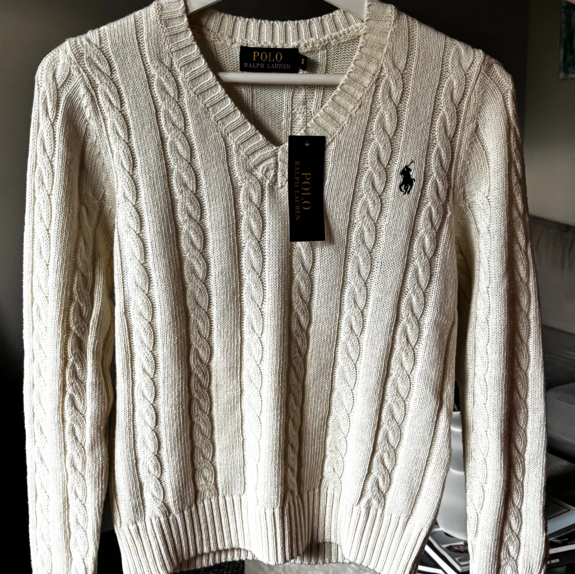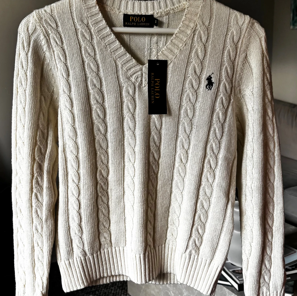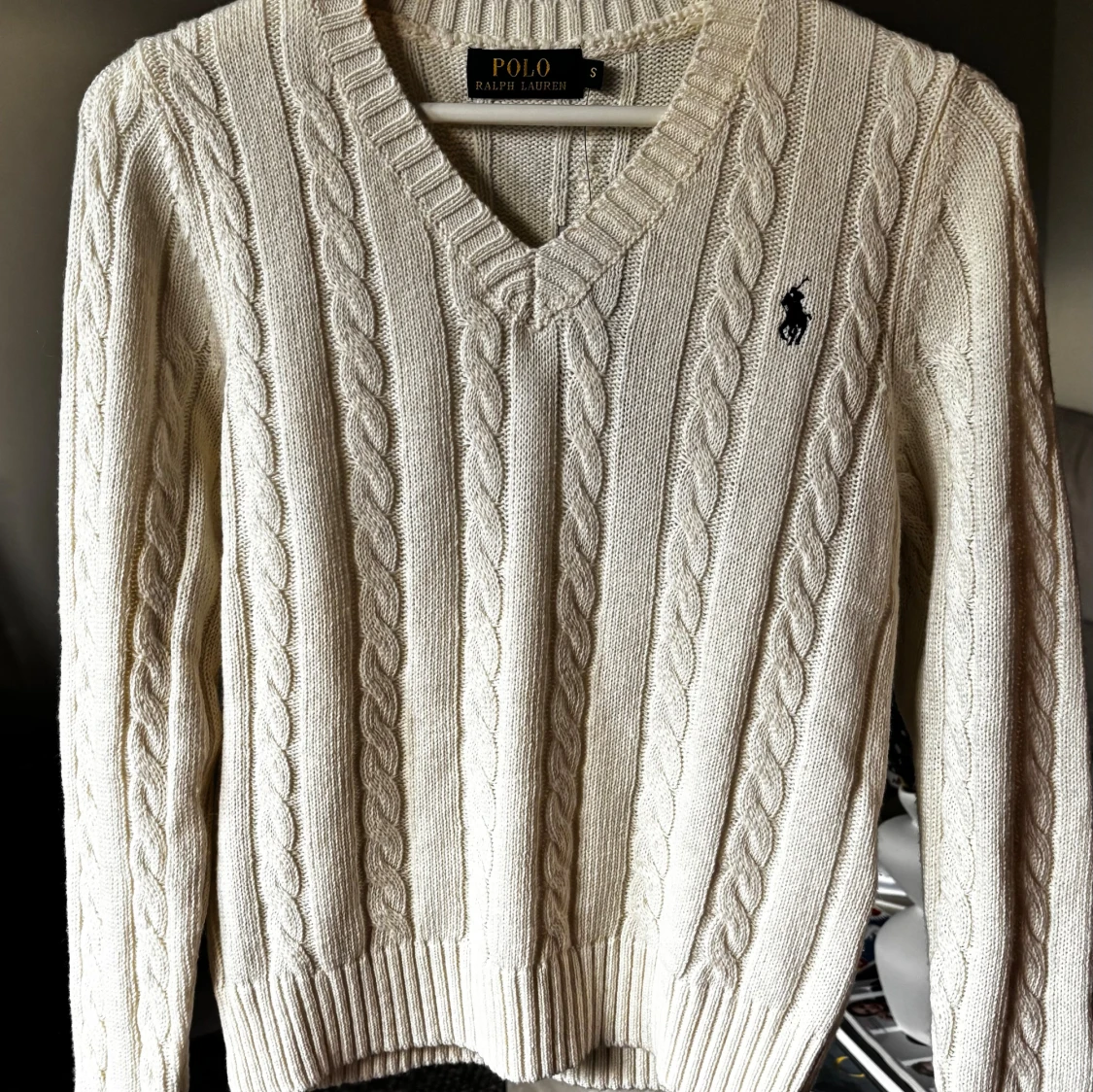Kabelstickad vit tröja från Polo Ralph Lauren med klassisk v-ringning och broderad logga på bröstet. Tröjan har lång ärm, ribbade muddar och är gjord i mjuk bomull. Perfekt för lager-på-lager och snygg till jeans eller kjol.