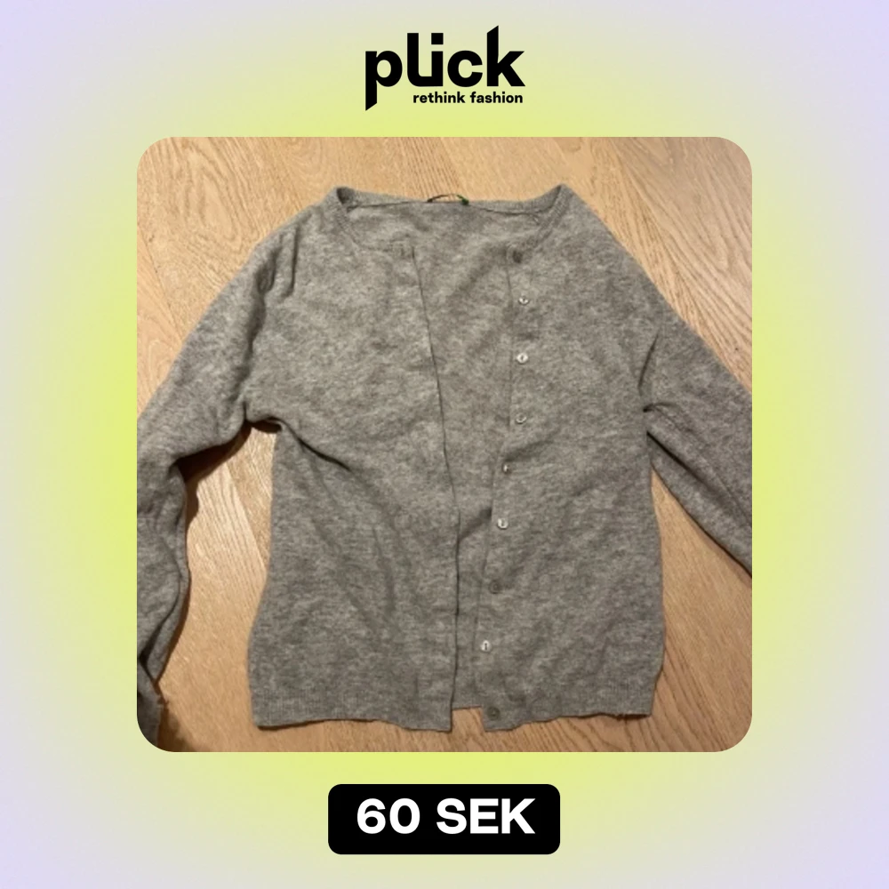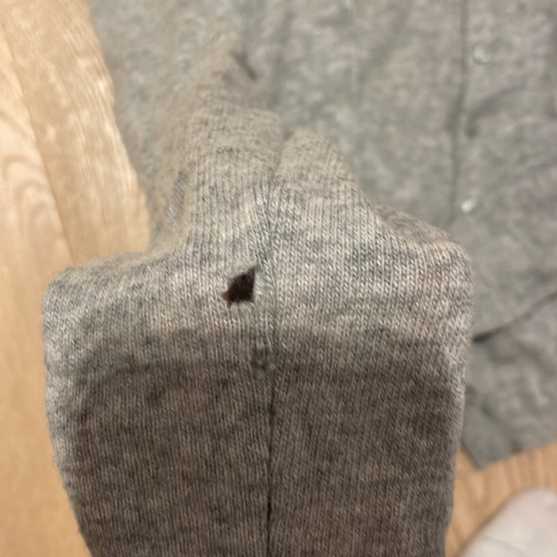 Grå kofta, två hål, ett som jag har sytt Står ingen storlek men gissar på S/xs