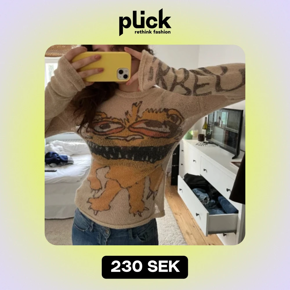 Jätte cool genomskinligt stickad tröja med tryck och text på sidan av armen. Använd 1 gång så super bra skick