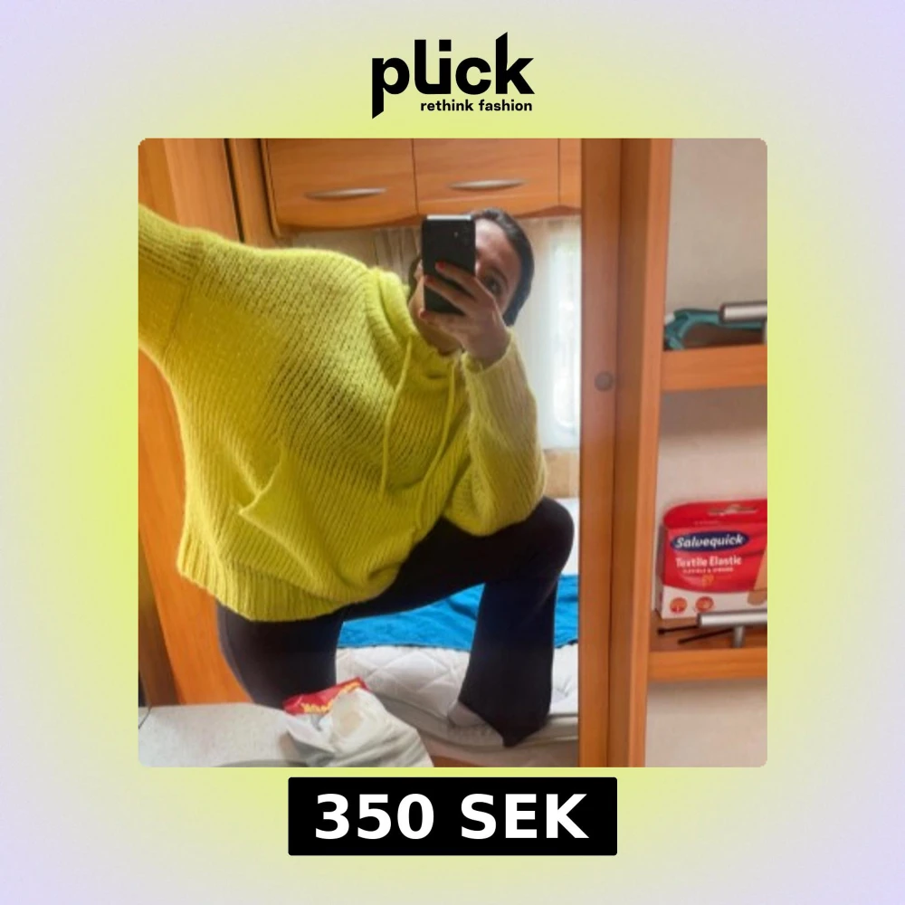 Säljer en oversized gul stickad hoodie med huva och dragsko. Tröjan har långa ärmar och är perfekt för dig som gillar en avslappnad och trendig stil. Supermjuk och skön att ha på sig!