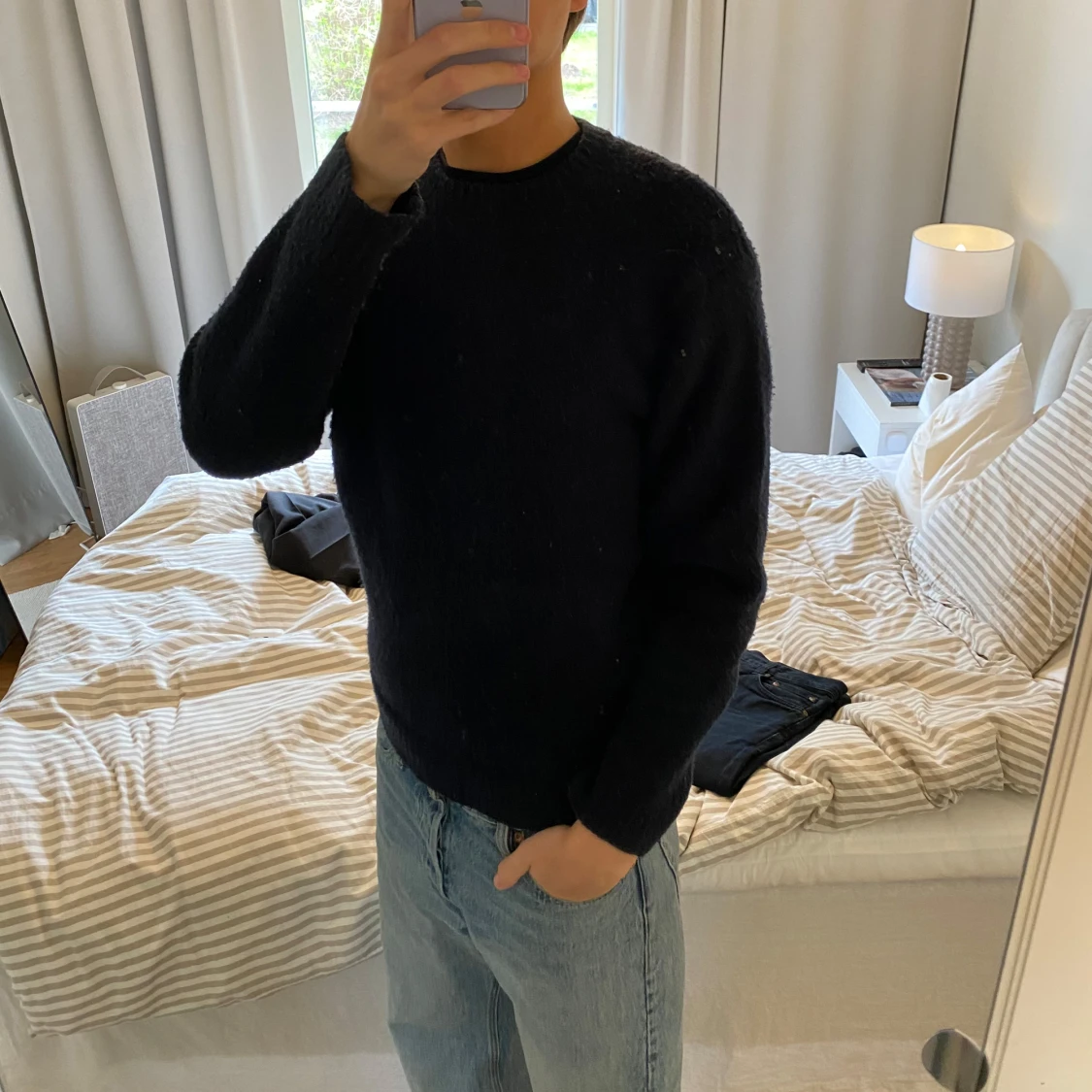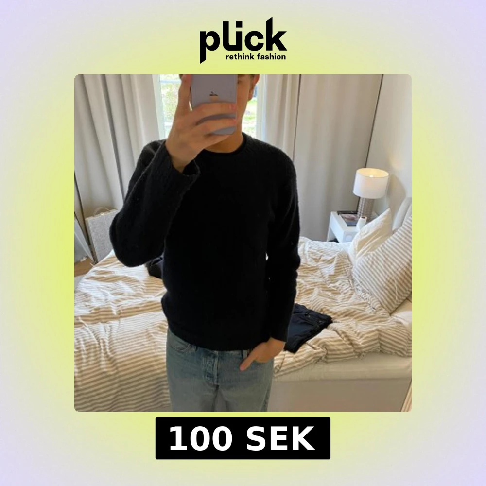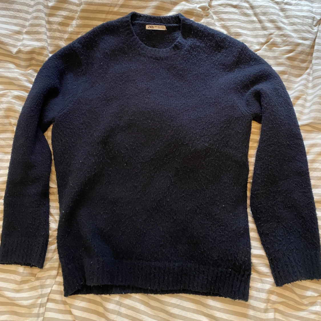 Säljer en mörkblå stickad tröja från Zara med rund halsringning och långa ärmar. Tröjan har en enkel och klassisk design med ribbade muddar vid ärmslut och nederkant. Perfekt för kyligare dagar.