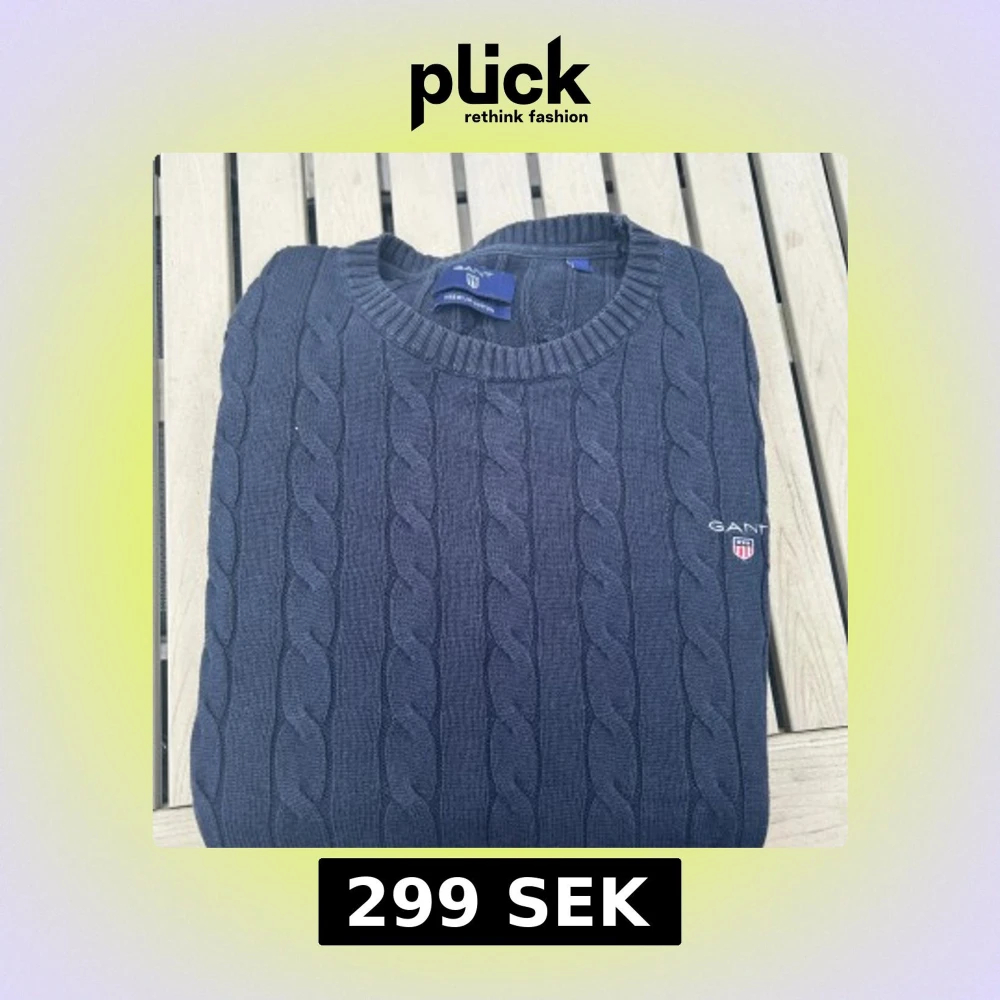 Säljer en stilren mörkblå stickad tröja från GANT i premium bomull. Tröjan har ett klassiskt kabelstickat mönster och rund halsringning. Perfekt för kyligare dagar.