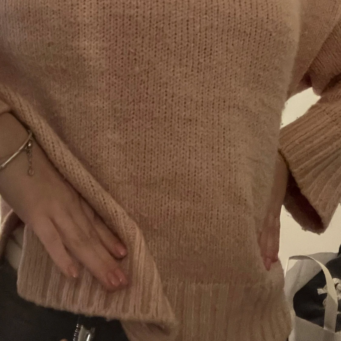 Mysig superfin rosa stickad tröja med långa ärmar och ribbade detaljer vid ärmslut och nederkant. Andra bilden ger bäst bild på hur tröjan ser ut i färgen. 💕