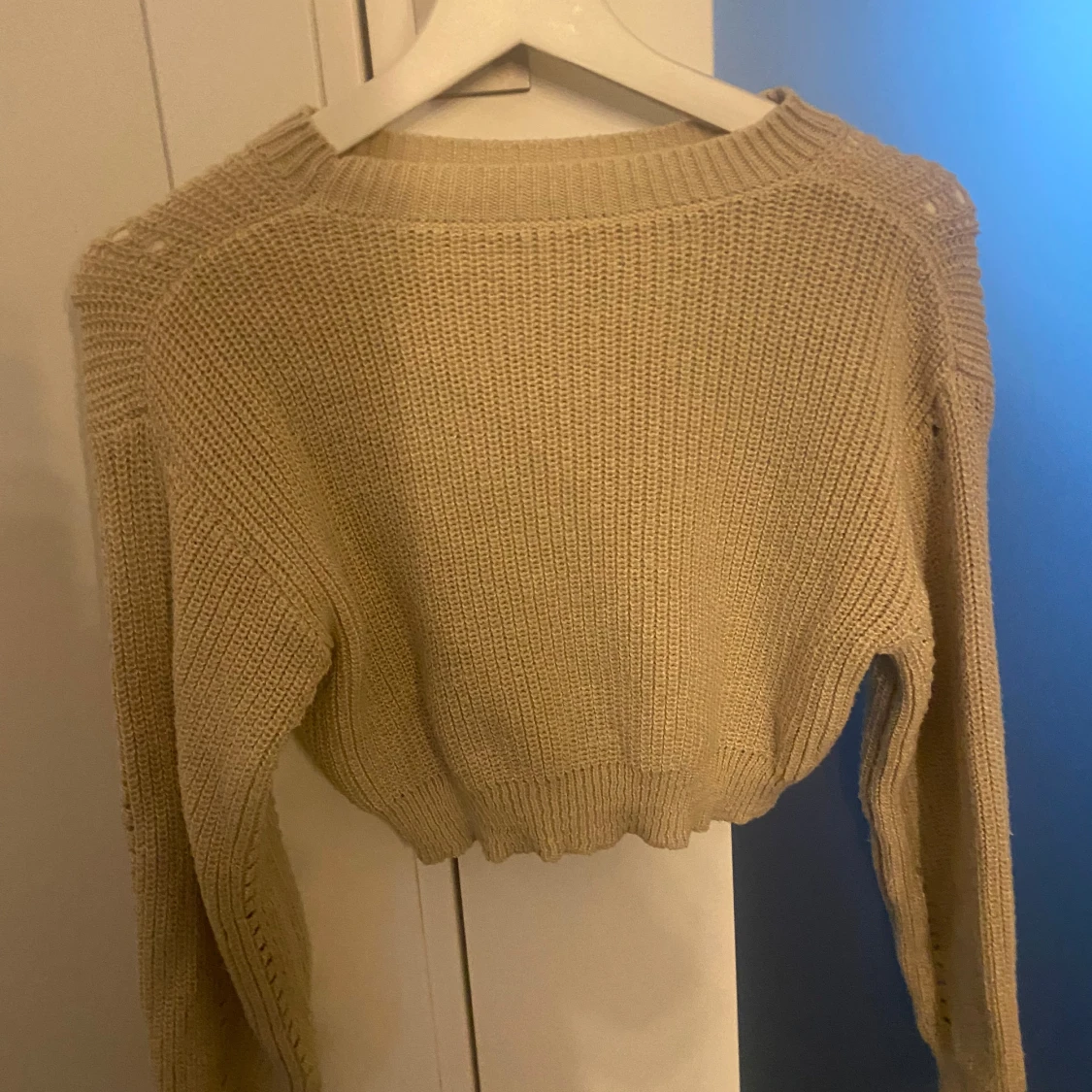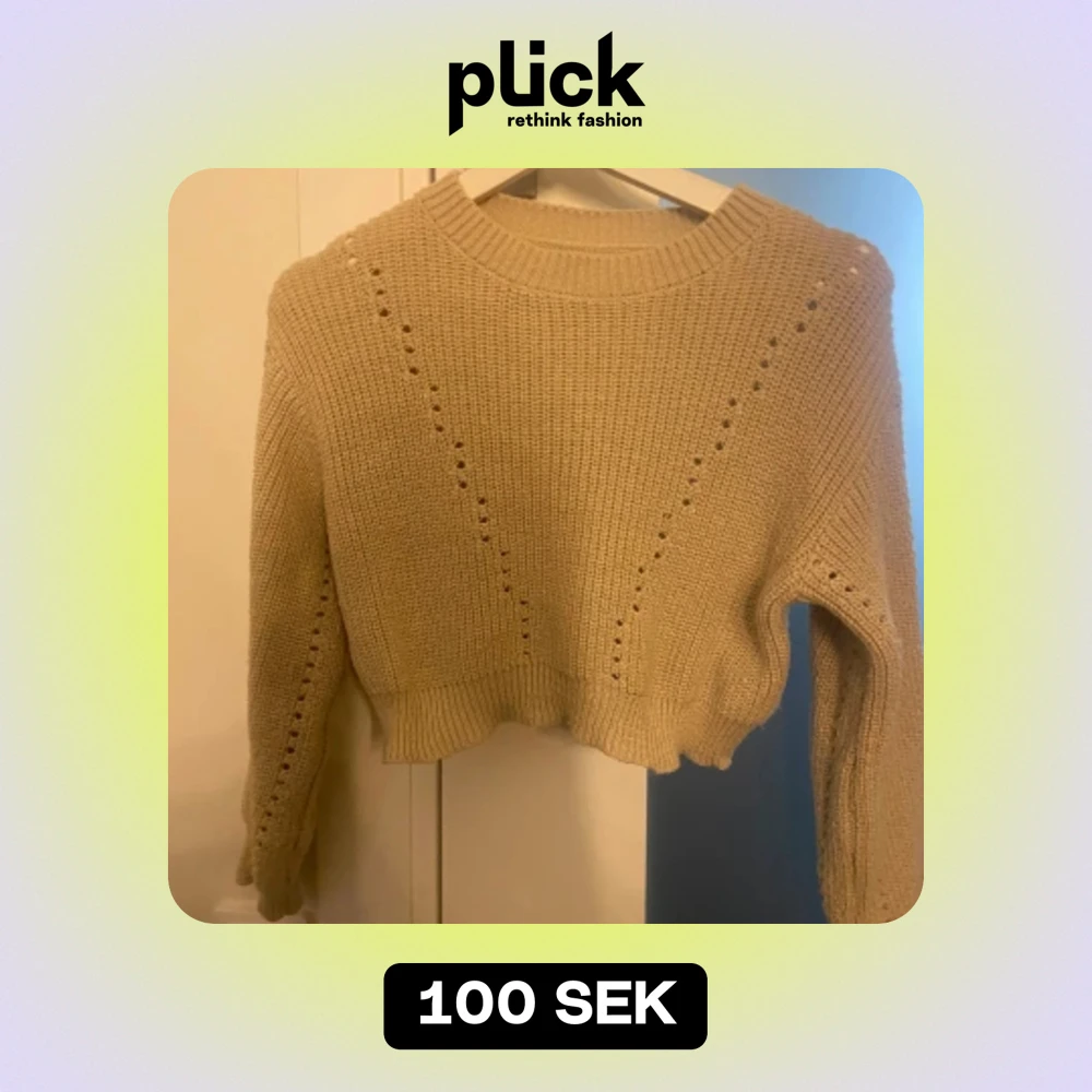 Säljer en superfin beige stickad tröja. Den är croppad och har ett snyggt mönster med små hål längs ärmarna och fram. Perfekt för höst och vinter! Tröjan är i nyskick och väldigt mysig att ha på sig. Passar perfekt till både jeans och kjol.