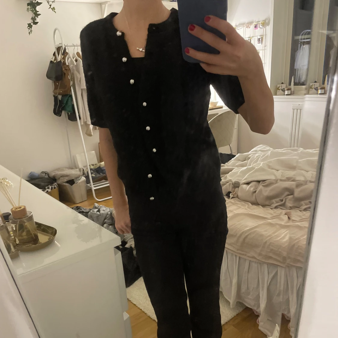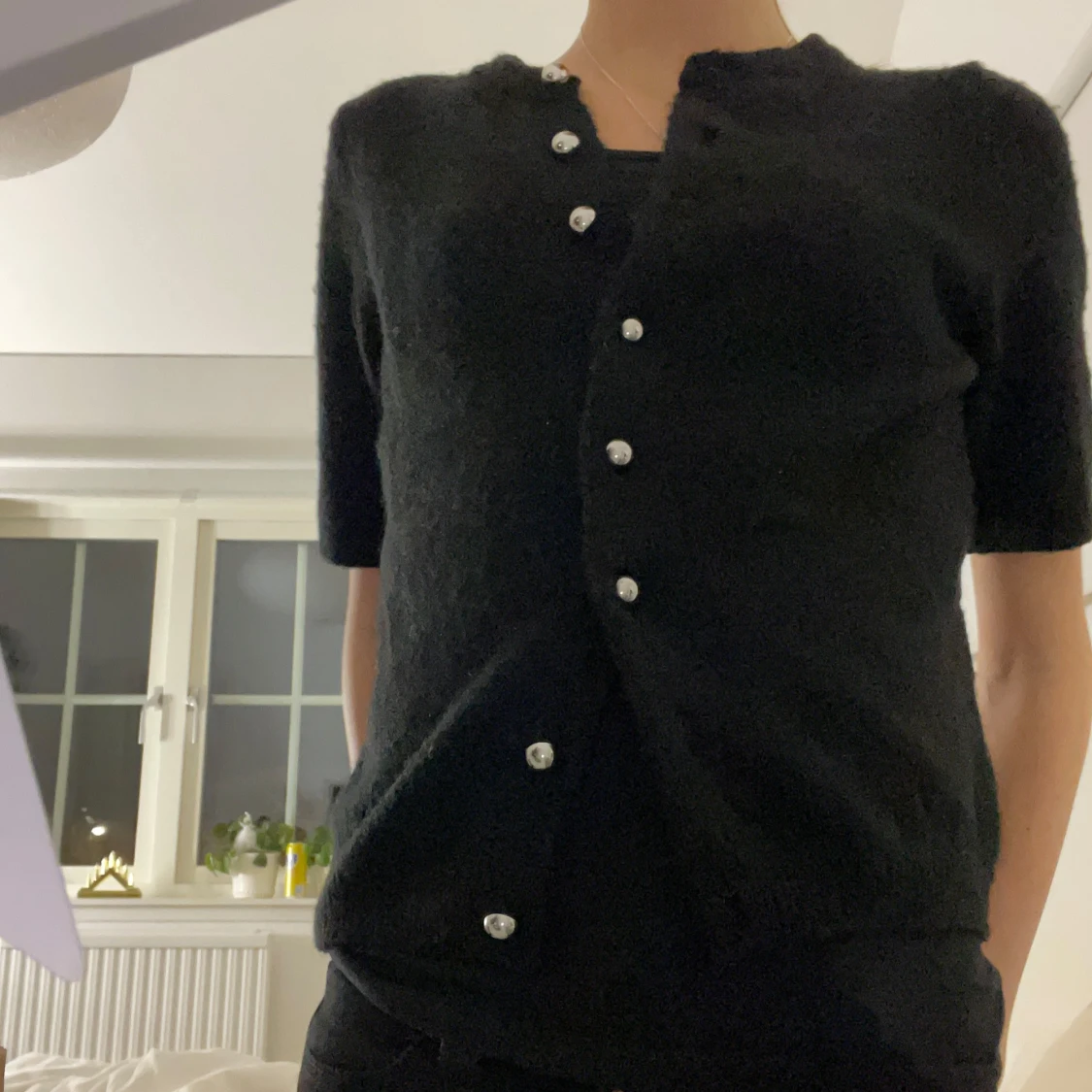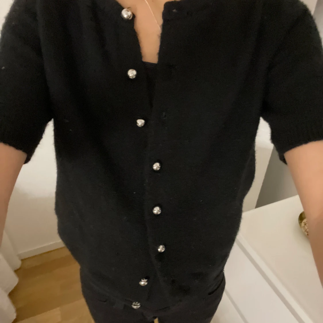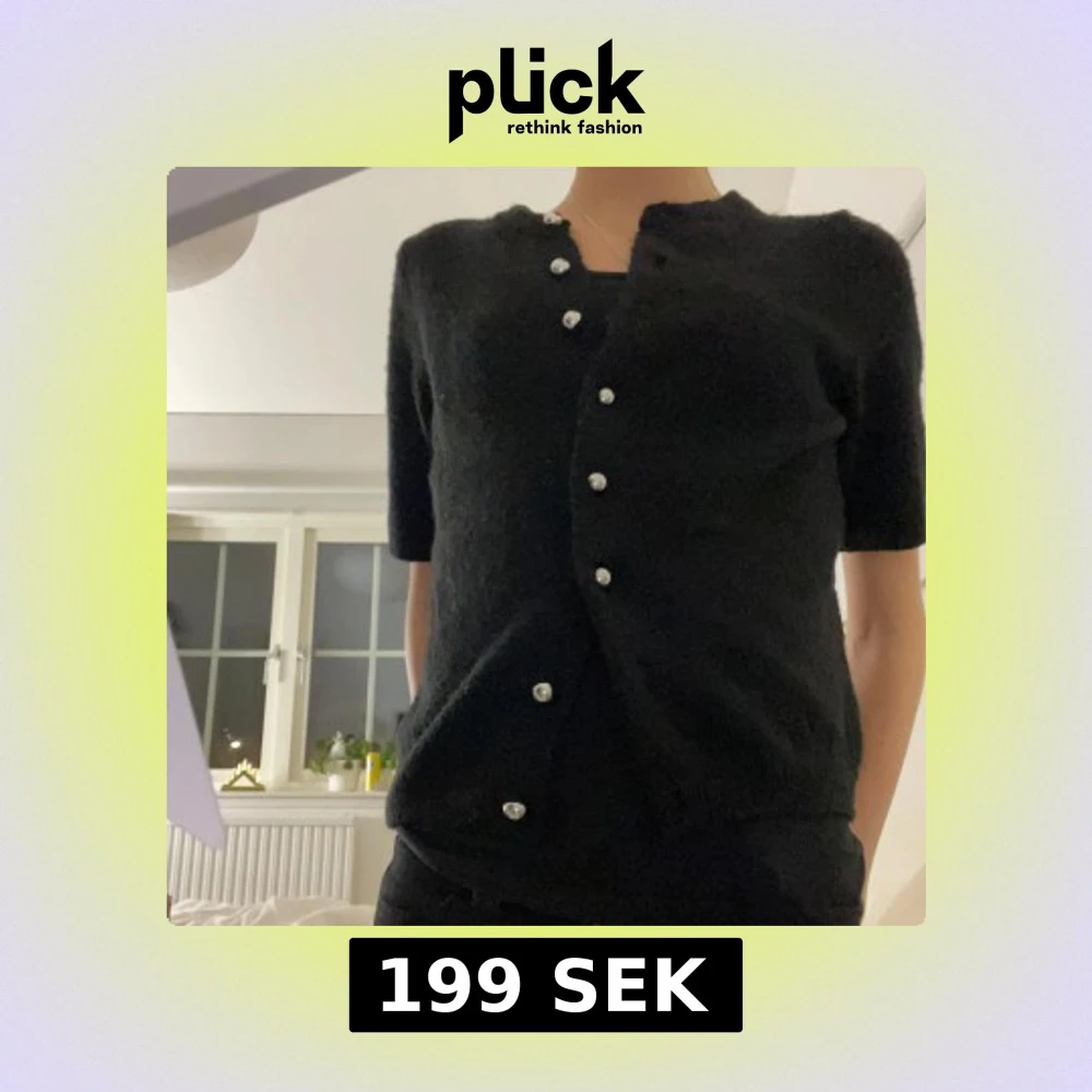 Snygg svart kofta med korta ärmar och dekorativa knappar. Jätte skönt material. Använd ändast 2 gånger.