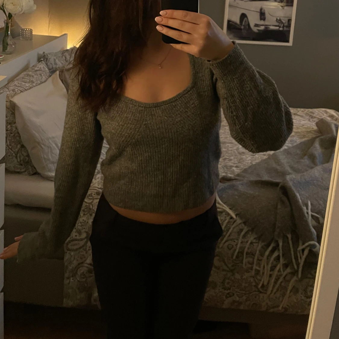 Grå stickad tröja från H&M med bred, rundad urringning och långa ärmar.💕