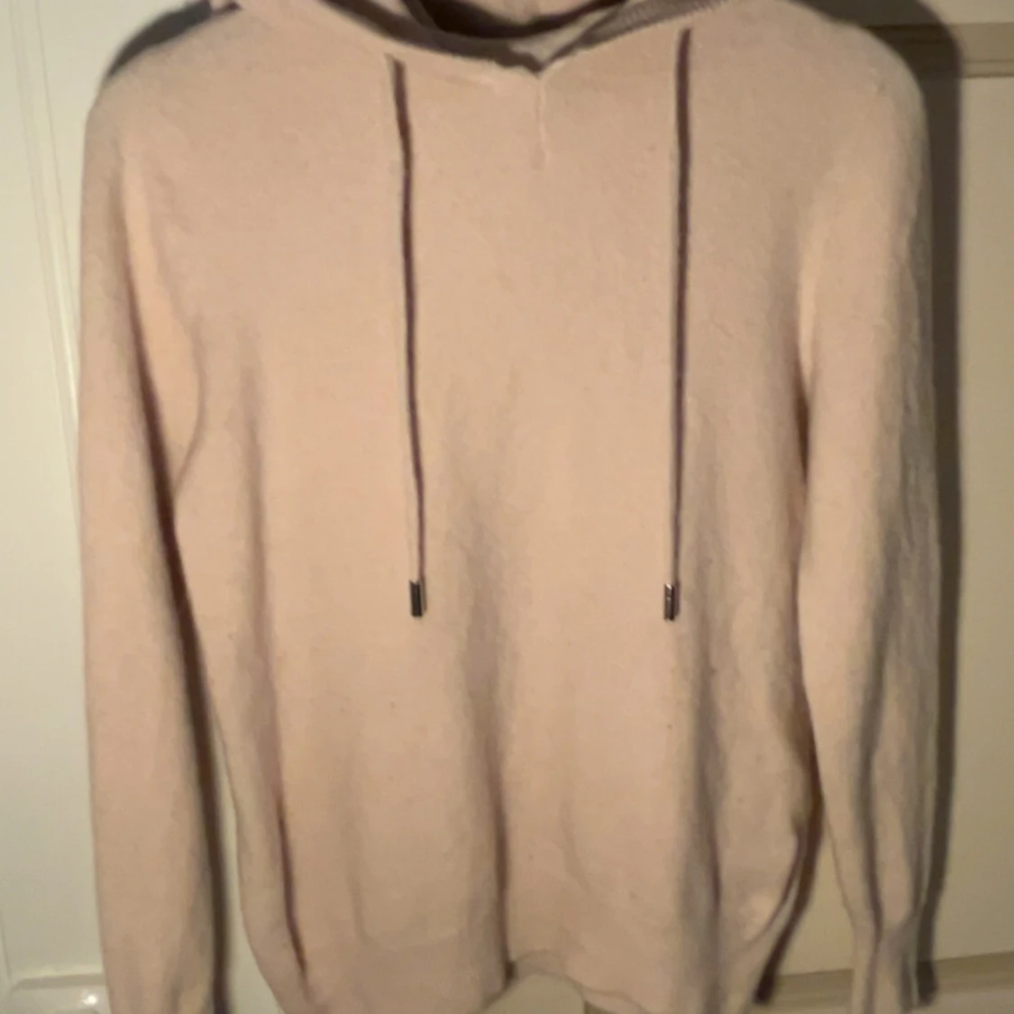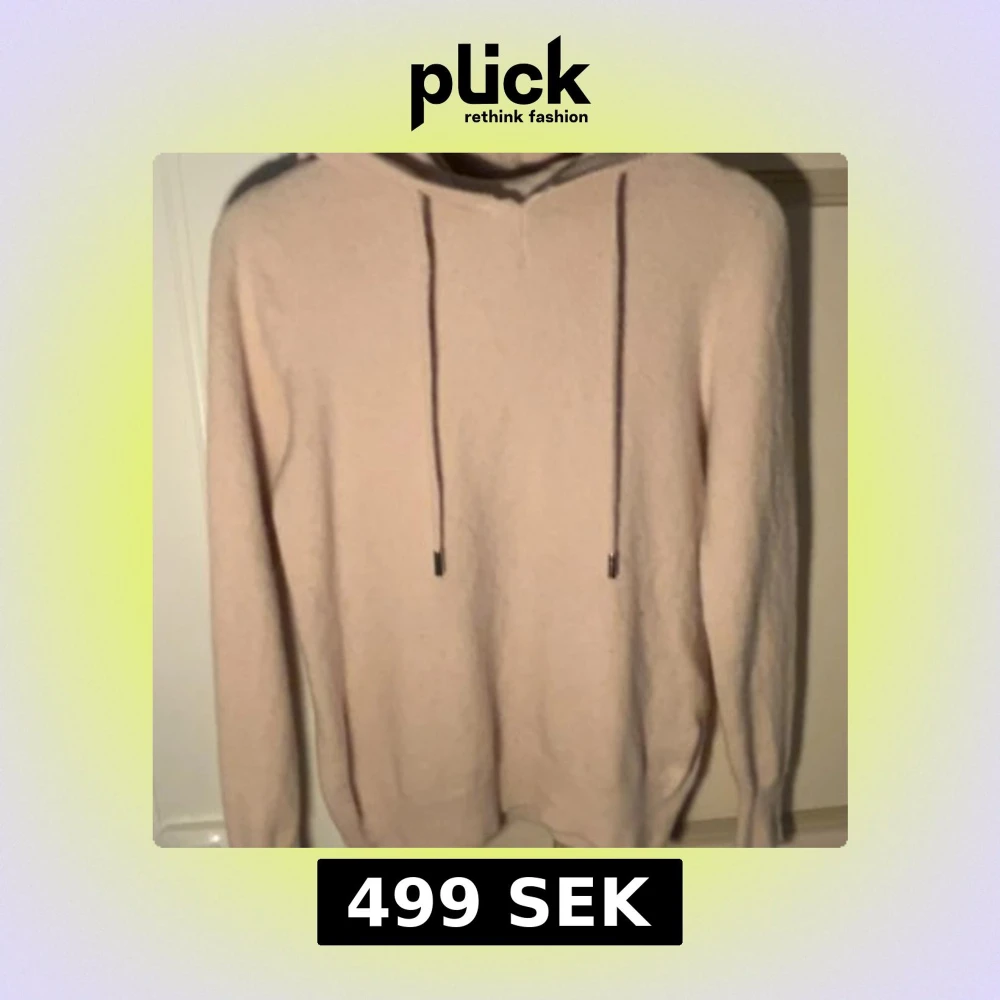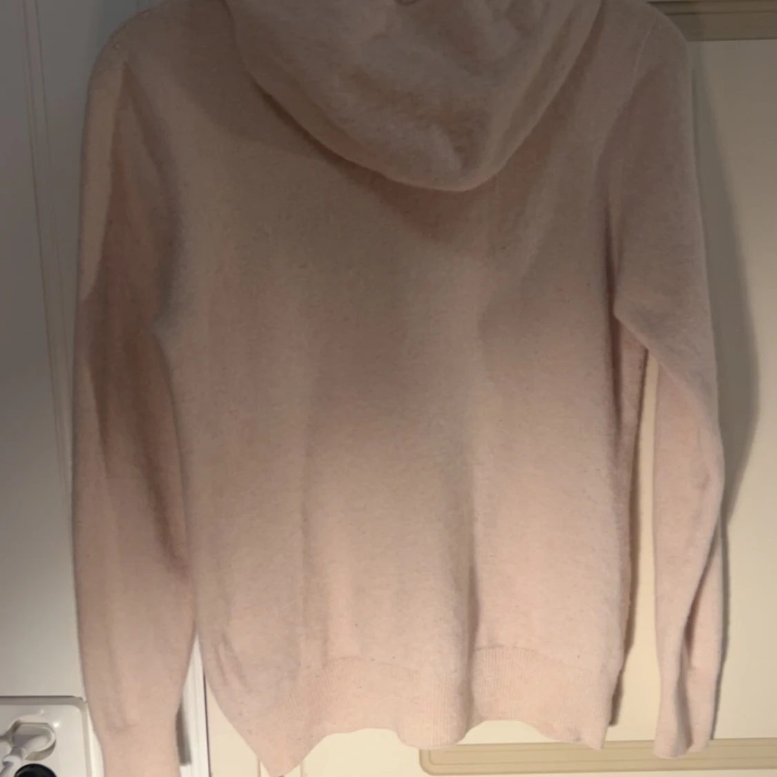 Mysig ljusrosa hoodie med huva och långa ärmar. Tröjan har snörning framtill och är tillverkad i ett mjukt stickat material som känns skönt mot huden. Perfekt för dig som gillar en enkel och chill stil. En liten deffekt vid kragen som smått blivit riven isär men har sytts ihop. Plagget har tagit väl hand om gällande tvätt, bara handtvätt.