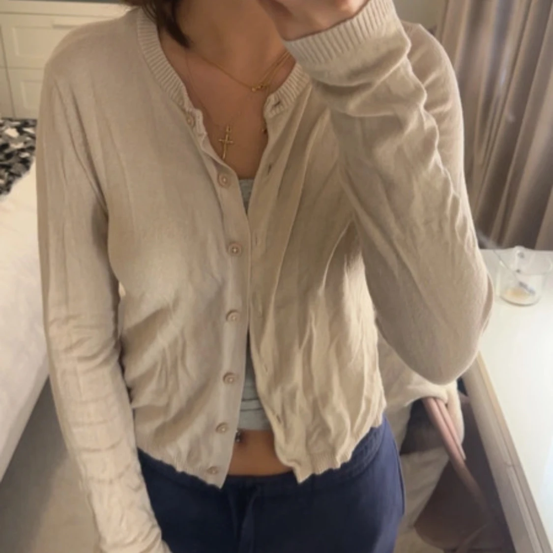 Säljer en beige kofta med rund hals och knäppning framtill. Koftan är tunn och har långa ärmar med ribbade muddar. Perfekt att slänga över ett linne eller t-shirt.