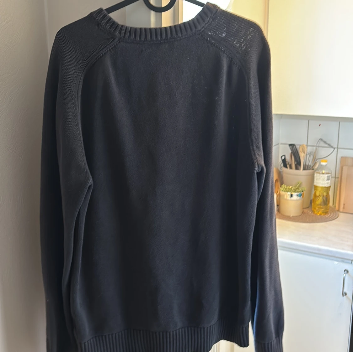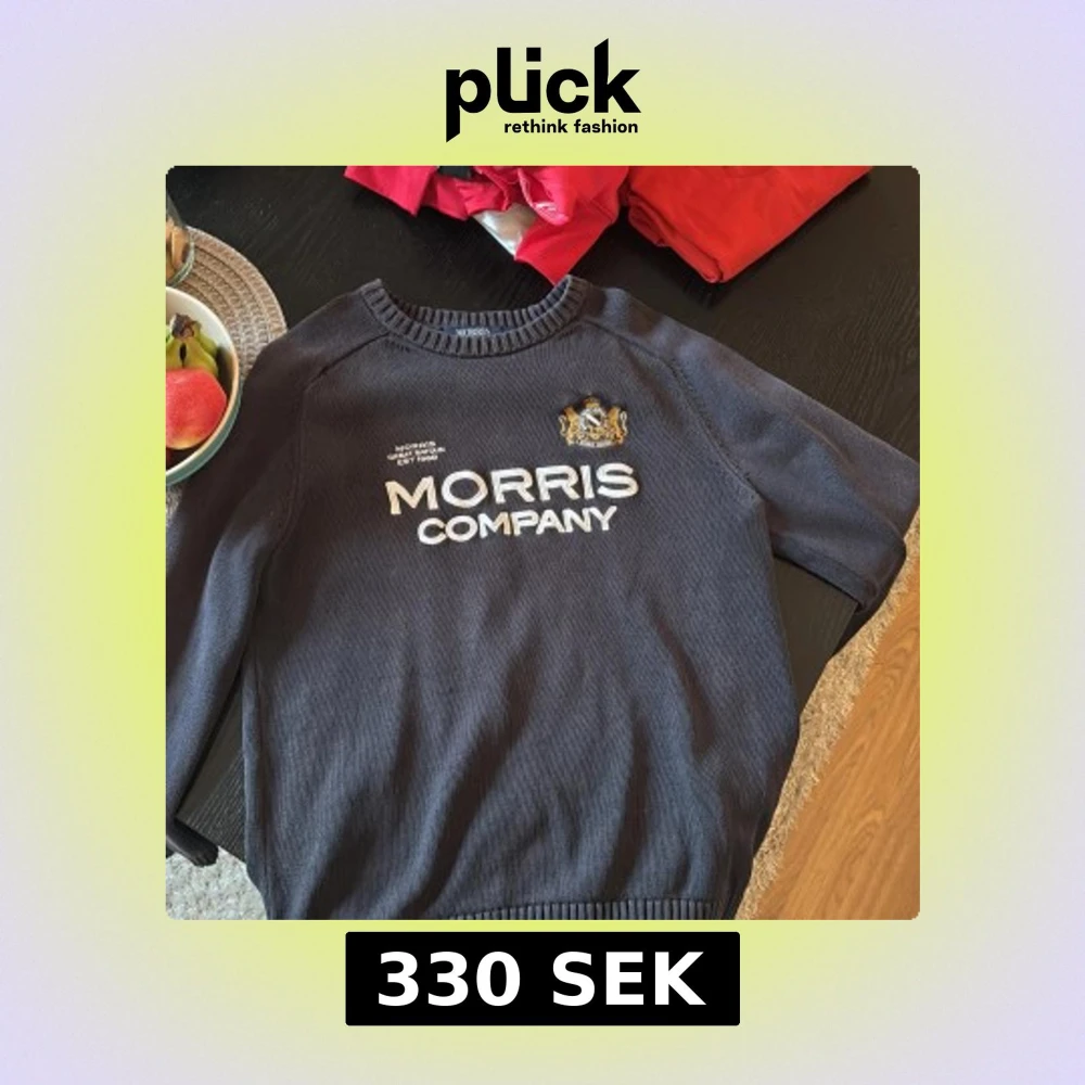 Säljer en snygg mörkblå tröja från Morris med broderad logga och text på framsidan. Tröjan har långa ärmar och ribbade kanter vid hals, ärmslut och nederkant. Perfekt för en stilren look.