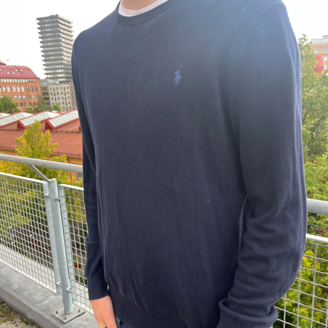 Stickad tröja från polo Ralph Lauren, bra skick i storlek M. Modellen på bilden är 186 cm lång men den sitter lite kort på honom. Hör av dig vid frågor!!