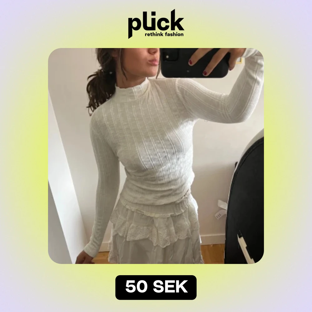 Säljer en snygg vit ribbad polotröja i storlek S. Den är långärmad och har en tight passform som framhäver figuren. Perfekt för höst och vinter, och kan stylas både till vardags och fest. Tröjan är i nyskick och väldigt bekväm att ha på sig.