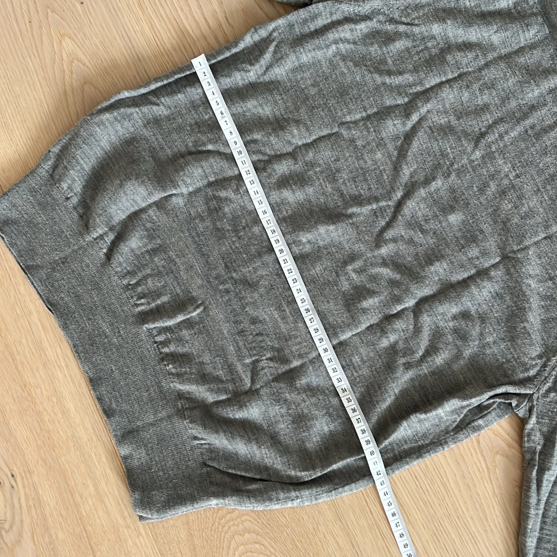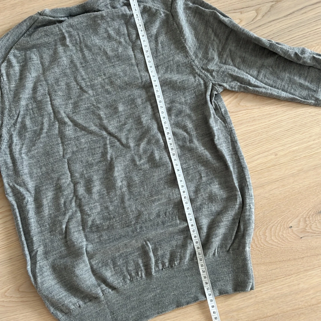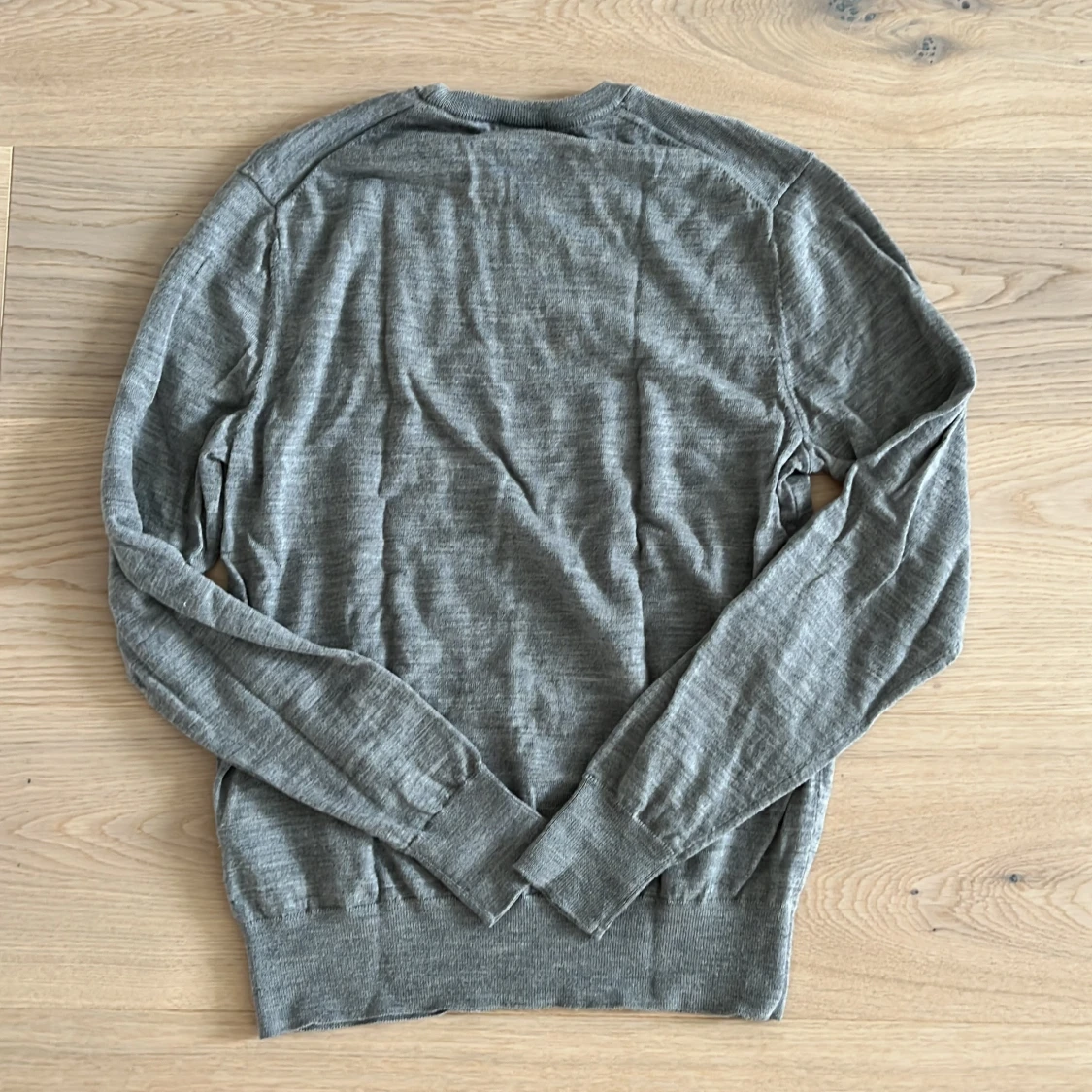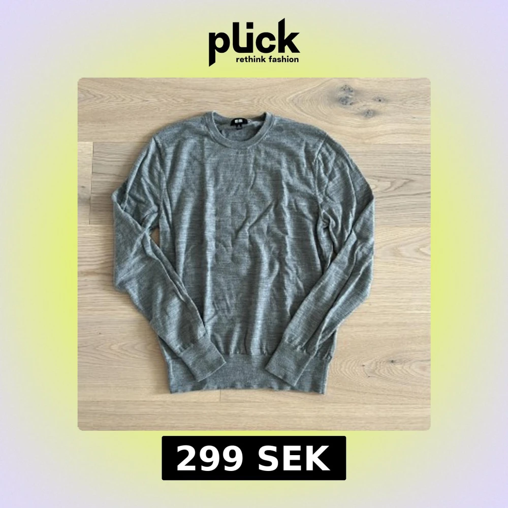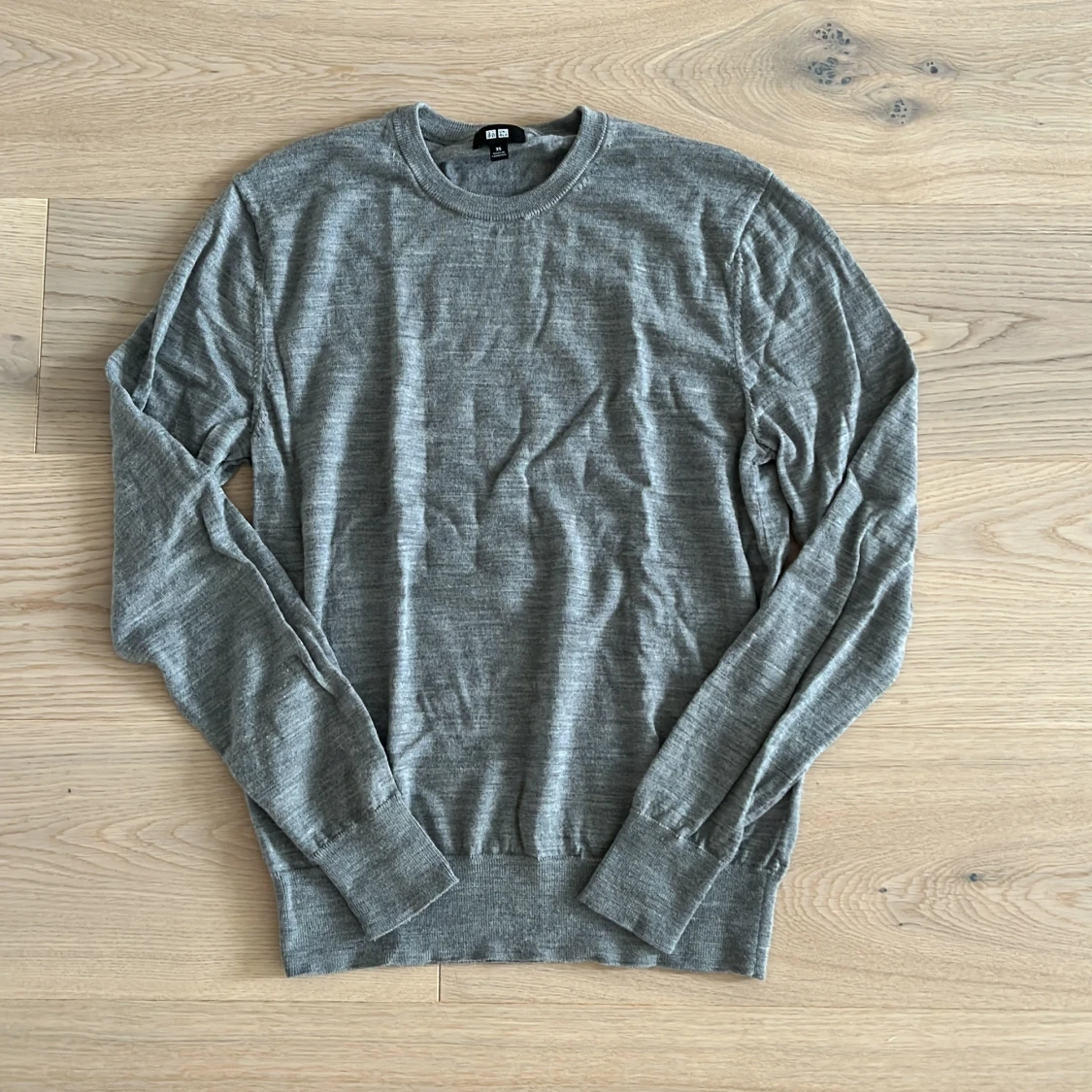 Säljer en stilren grå långärmad tröja från Uniqlo i mjuk merinoull. Tröjan har rund halsringning, ribbade muddar och en klassisk passform. Perfekt att slänga på sig när det är lite kyligare ute.