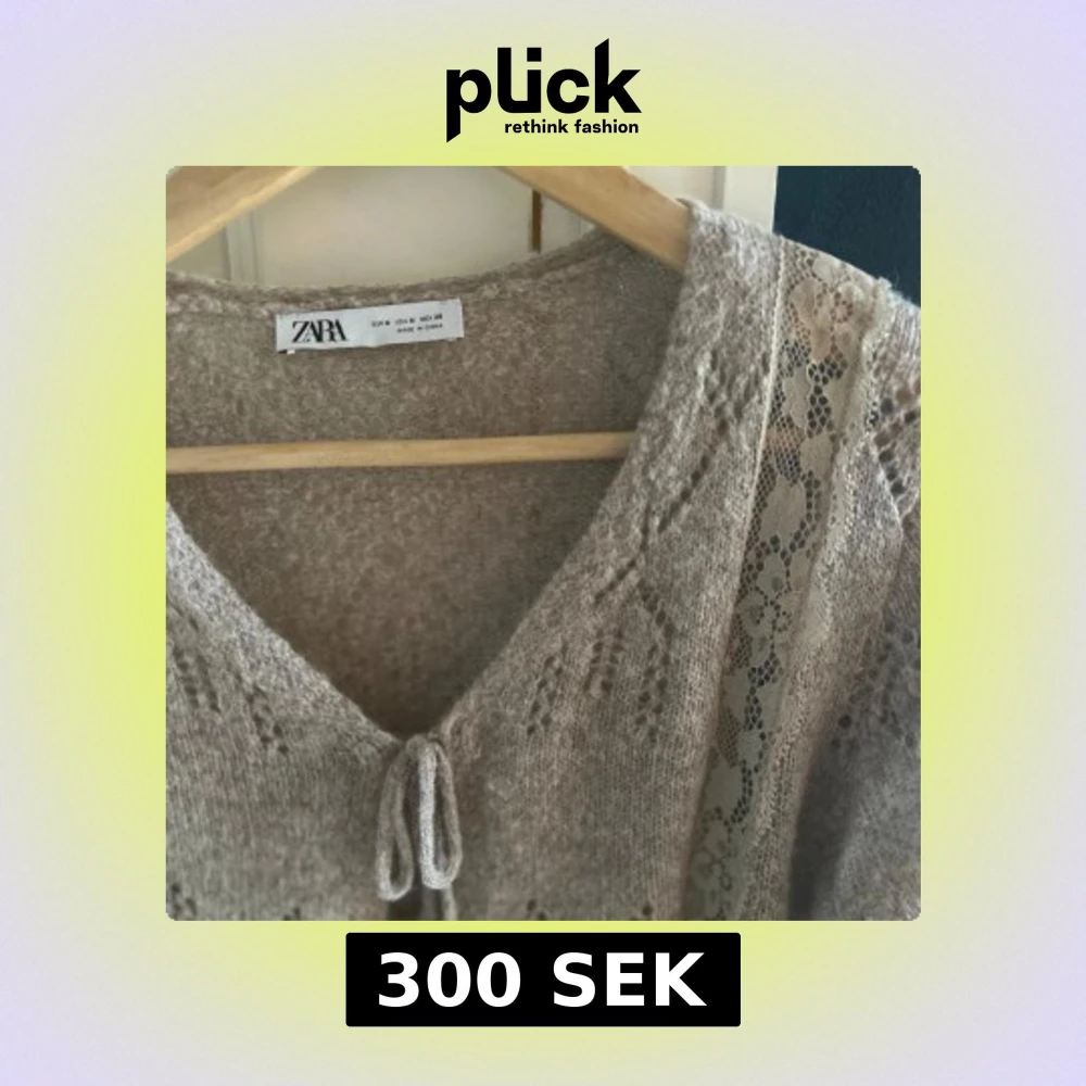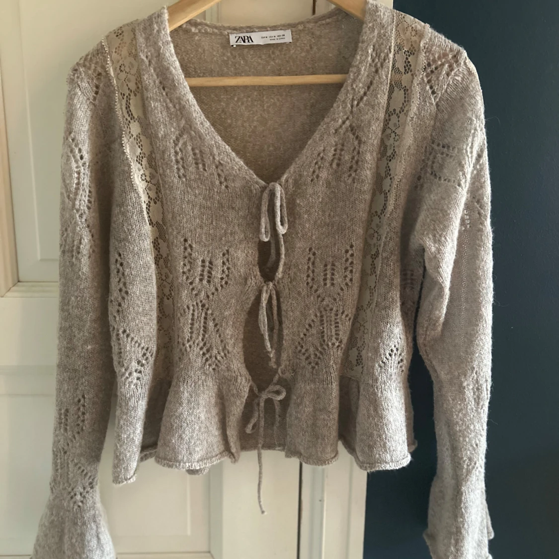 Supersöt beige stickad kofta från Zara med v-ringning, knyt framtill och spetsdetaljer längs axlarna. Koftan har ett fint hålmönster, volangkant nertill och långa ärmar. Perfekt för lager-på-lager. Tröjan är köpt i Rom för ett halvår sedan men har knappt använts sedan dess och är i fint skick. Storleken är medium och nypris ligger kring 500 men jag säljer för 300 men priset är dock inte hugget i sten och jag är beredd att förhandla